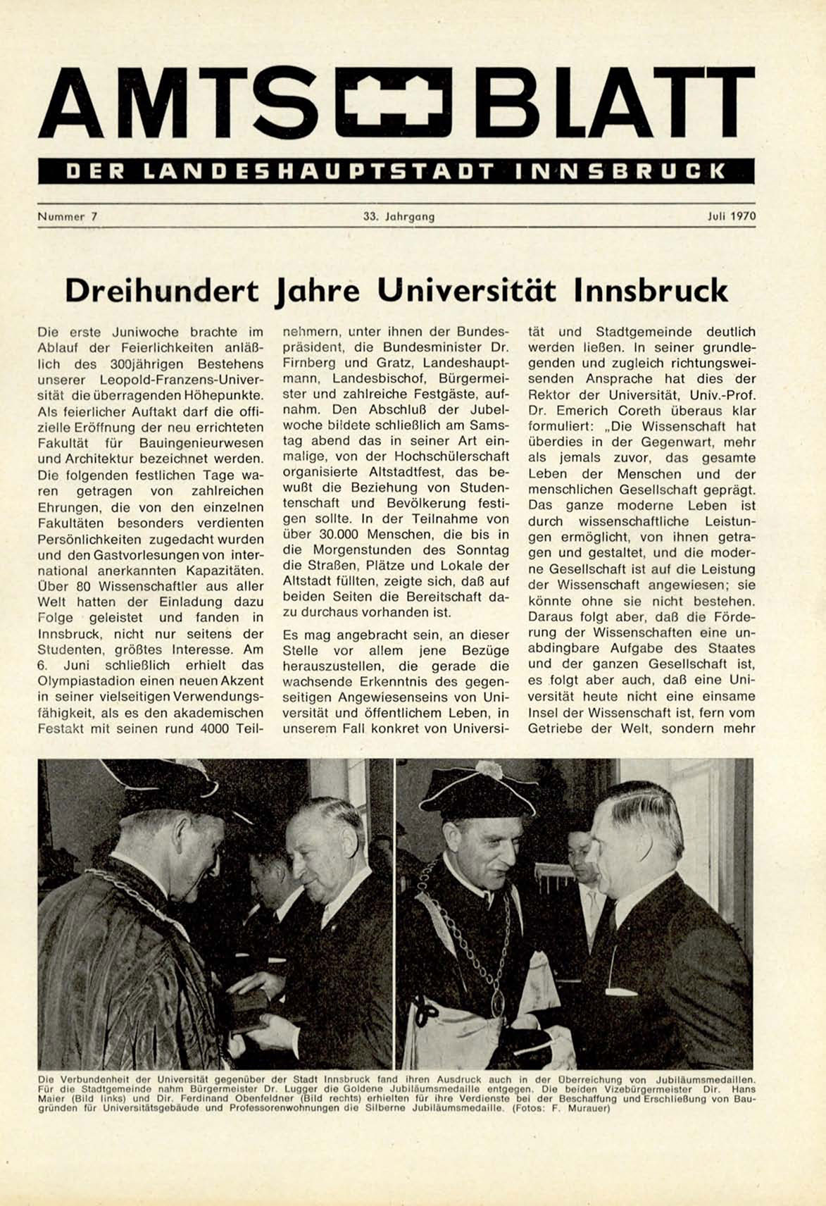 Die Verbundenheit der Universität gegenüber der Stadt Innsbruck fand ihren A u s d r u c k a u c h in der Überreichung von J u b i l ä u m s m e d a i l l e n .