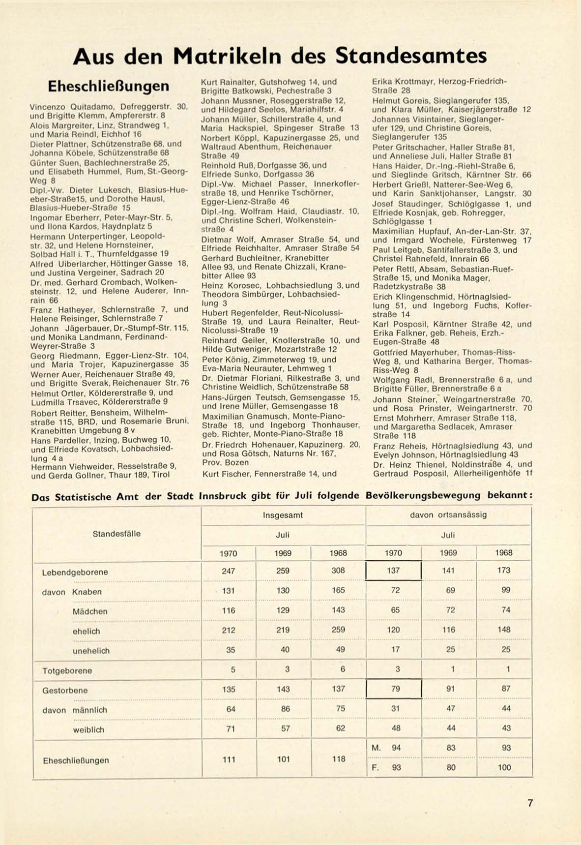 der Stadt Innsbruck gibt f ü r Juli folgende B e v ö l k e r u n g s b e w e g u n g