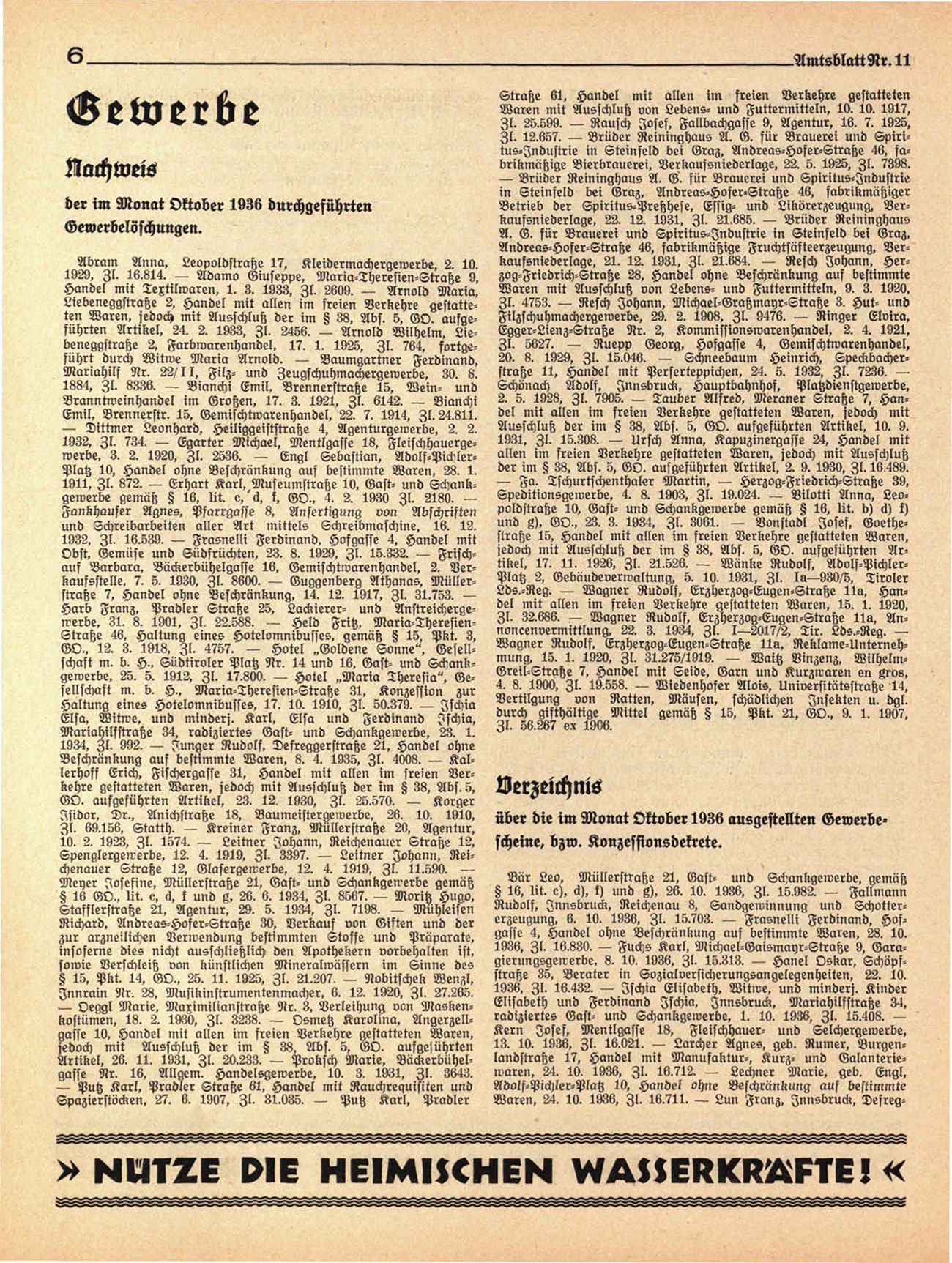 1936, Zl. 16.830. — Fuchs Karl, Michael-Gaismayr-Straße 9, Garagierungsgewerbe, 8. 10. 1936. Zl. 15.313. — Hanel Oskar. Schöpfstraße 35, Berater in Sozialversicherungsangelegenheiten, 22. 10.