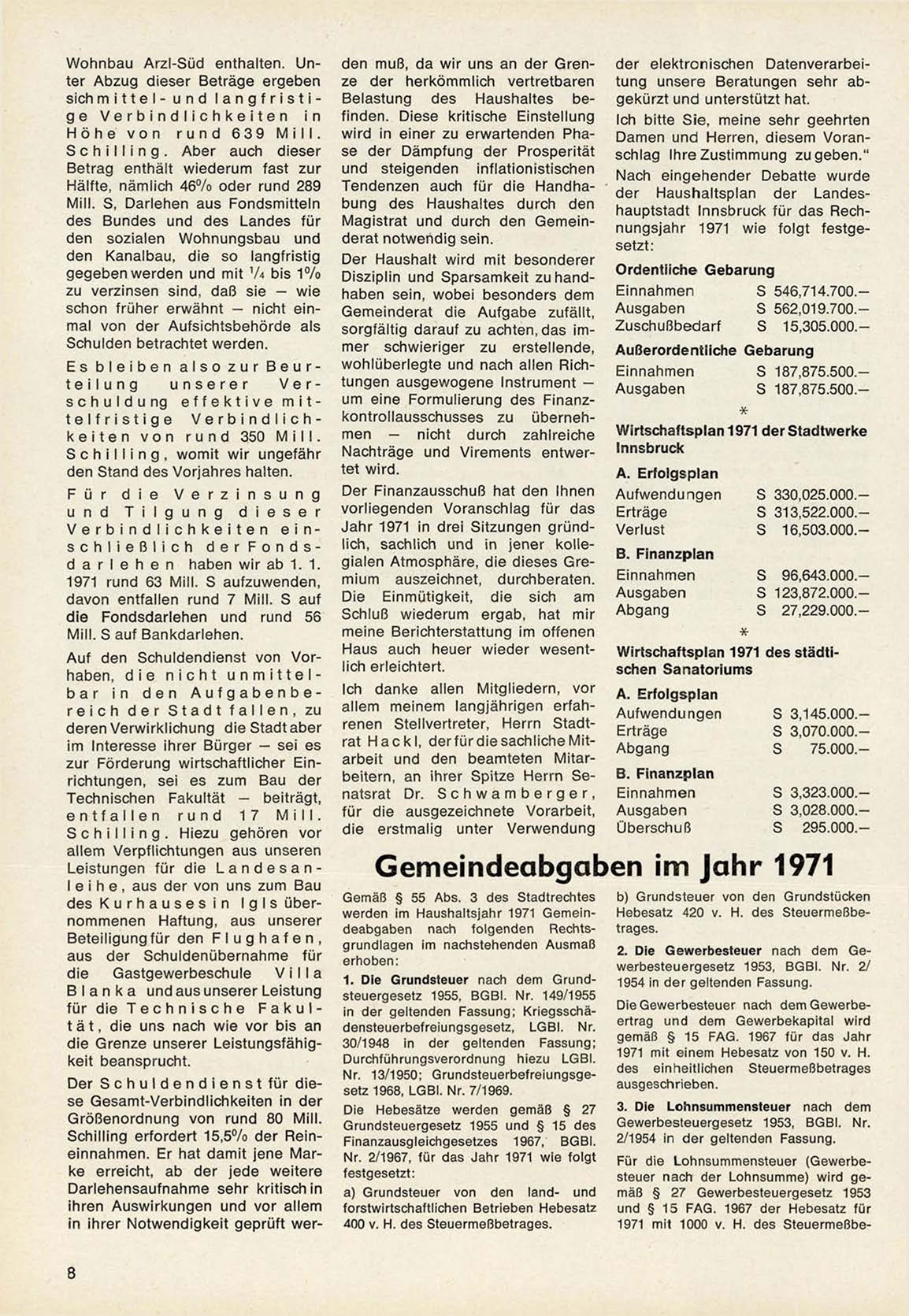 S 187,875.500.Wirtschaftsplan 1971 der Stadtwerke