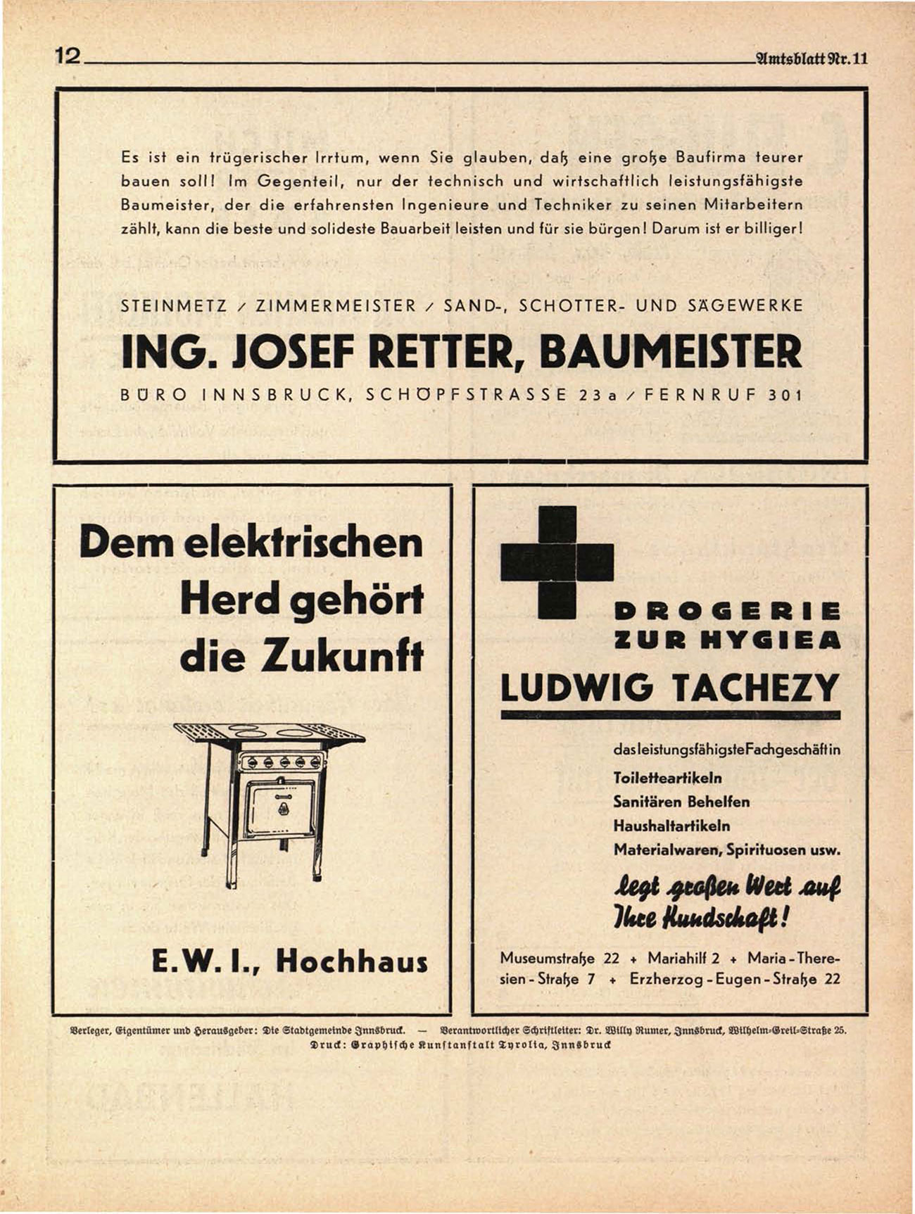 Verleger, Eigentümer und Herausgeber: Die Stadtgemewde Innsbruck. — Verantwortlicher Schriftleiter: Nr. Willy Rumer, Innsbruck, Wilhelm-Greil-Straße 25.