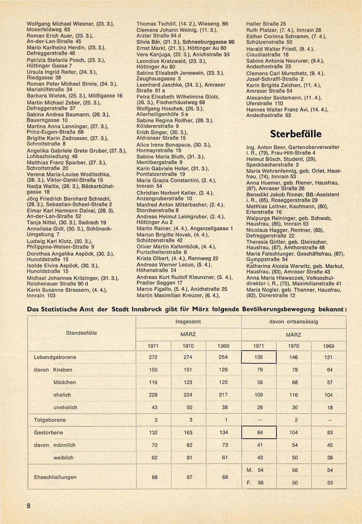 Das Statistische A m t der Stadt Innsbruck gibt für M ä r z folgende Bevölkerungsbewegung bekannt: