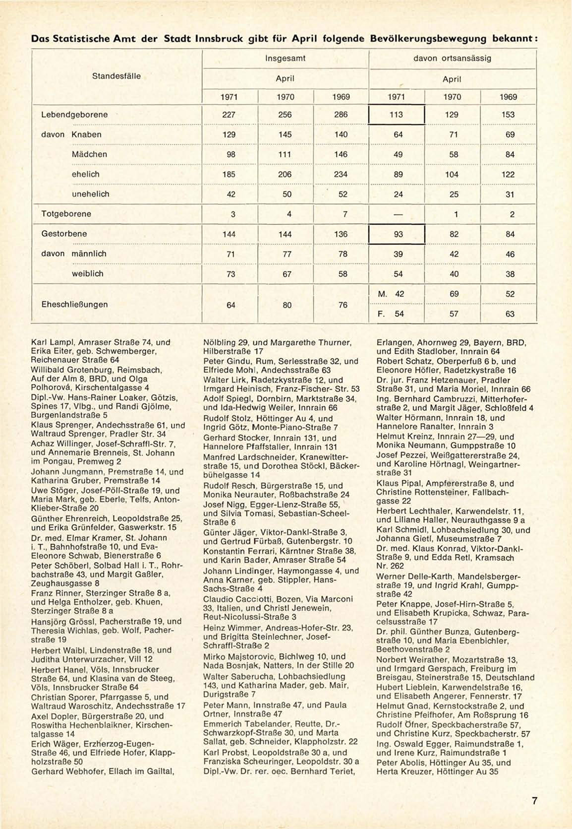 Das Statistische A m t der Stadt Innsbruck gibt für April folgende Bevölkerungsbewegung bekannt: