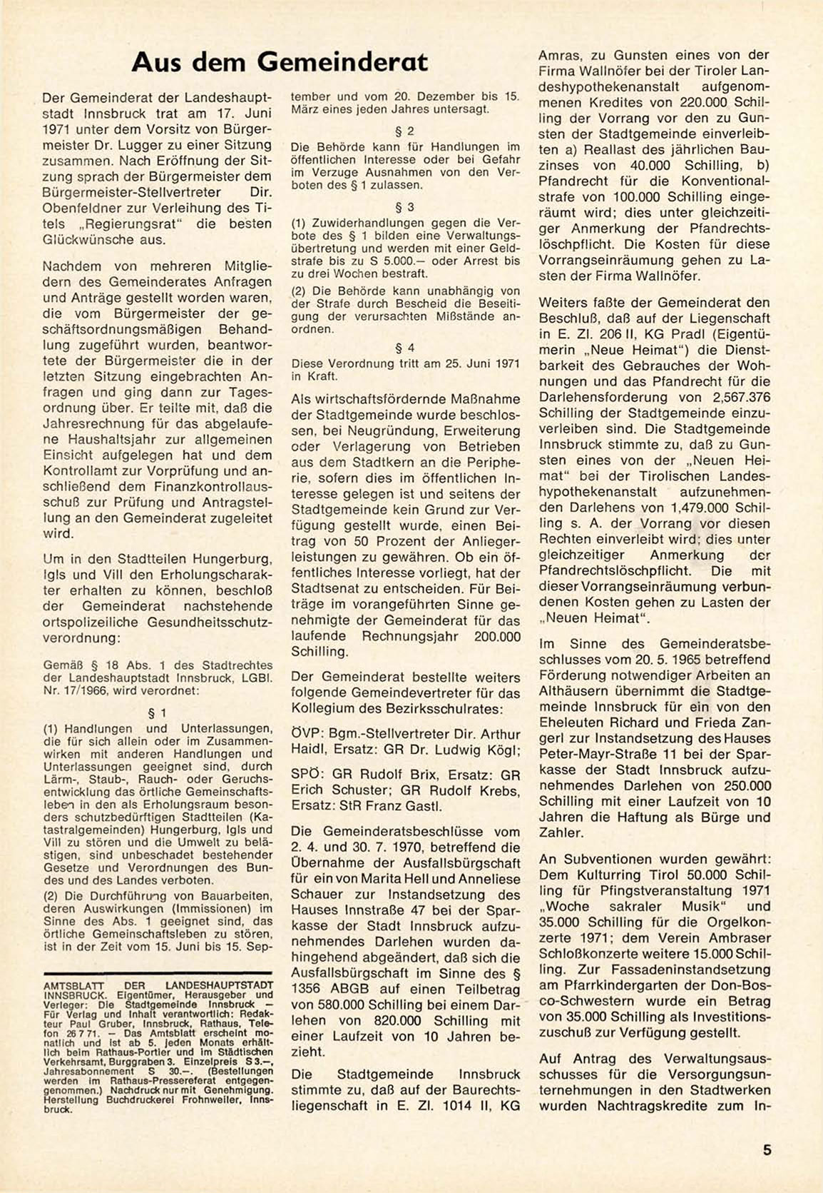 Für V e r l a g und Inhalt verantwortlich: R e d a k teur Paul G r u b e r , Innsbruck, Rathaus, T e l e fon 26 7 71. - Das Amtsblatt erscheint m o natlich und ist ab 5. jeden M o n a t s erhältlich b e i m R a t h a u s - P o r t l e r und Im Städtischen