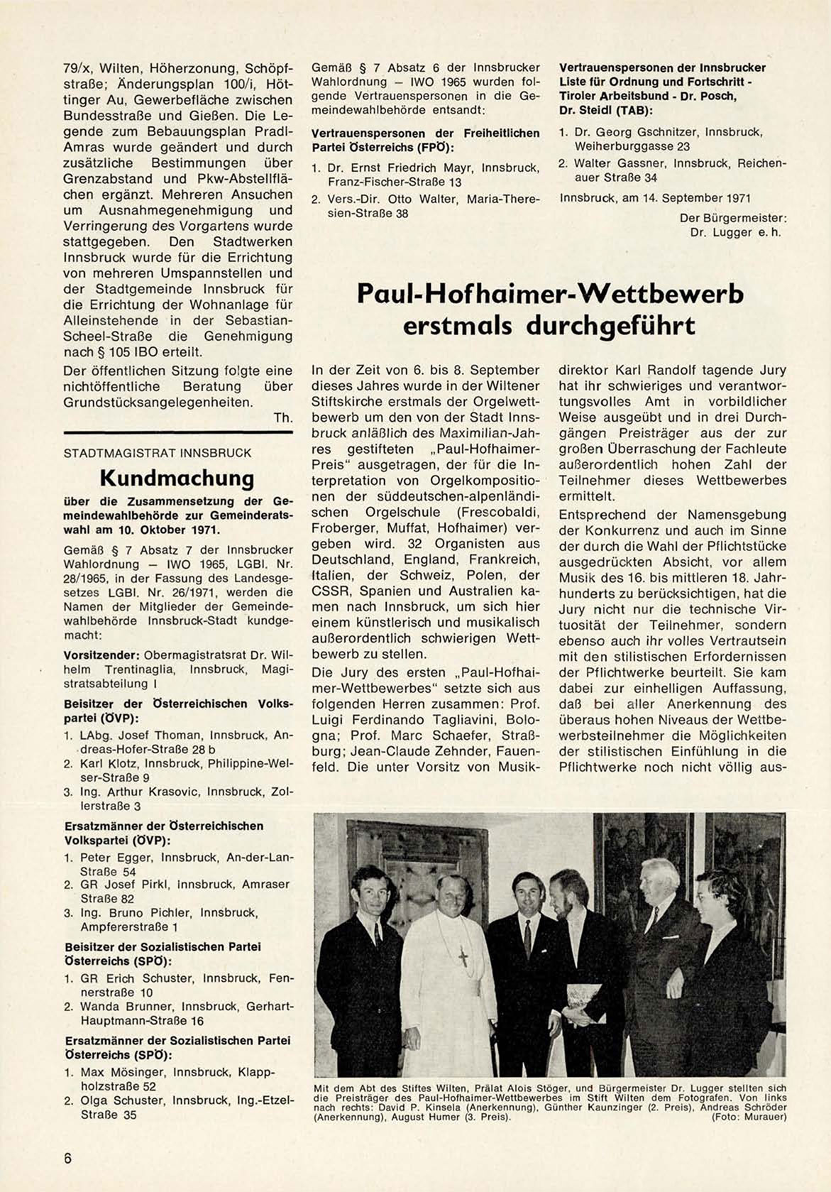 Stiftskirche erstmals der Orgelwettbewerb um den von der Stadt Innsbruck anläßlich des Maximilian-Jahres gestifteten „ Paul-Hof haimerPreis" ausgetragen, der für die Interpretation von Orgelkompositionen der süddeutschen-alpenländischen Orgelschule (Frescobaldi,