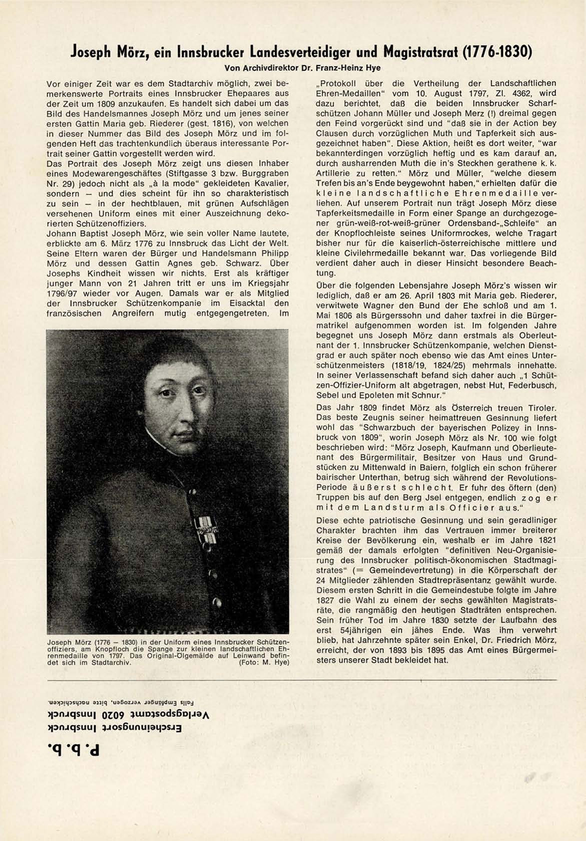 b e g e g n e t u n s J o s e p h Mörz d a n n erstmals als O b e r l e u t nant d e r 1. Innsbrucker S c h ü t z e n k o m p a n i e , w e l c h e n D i e n s t grad er auch später noch e b e n s o w i e d a s A m t e i n e s U n t e r schützenmeisters (1818/19, 1824/25) m e h r m a l s innehatte.