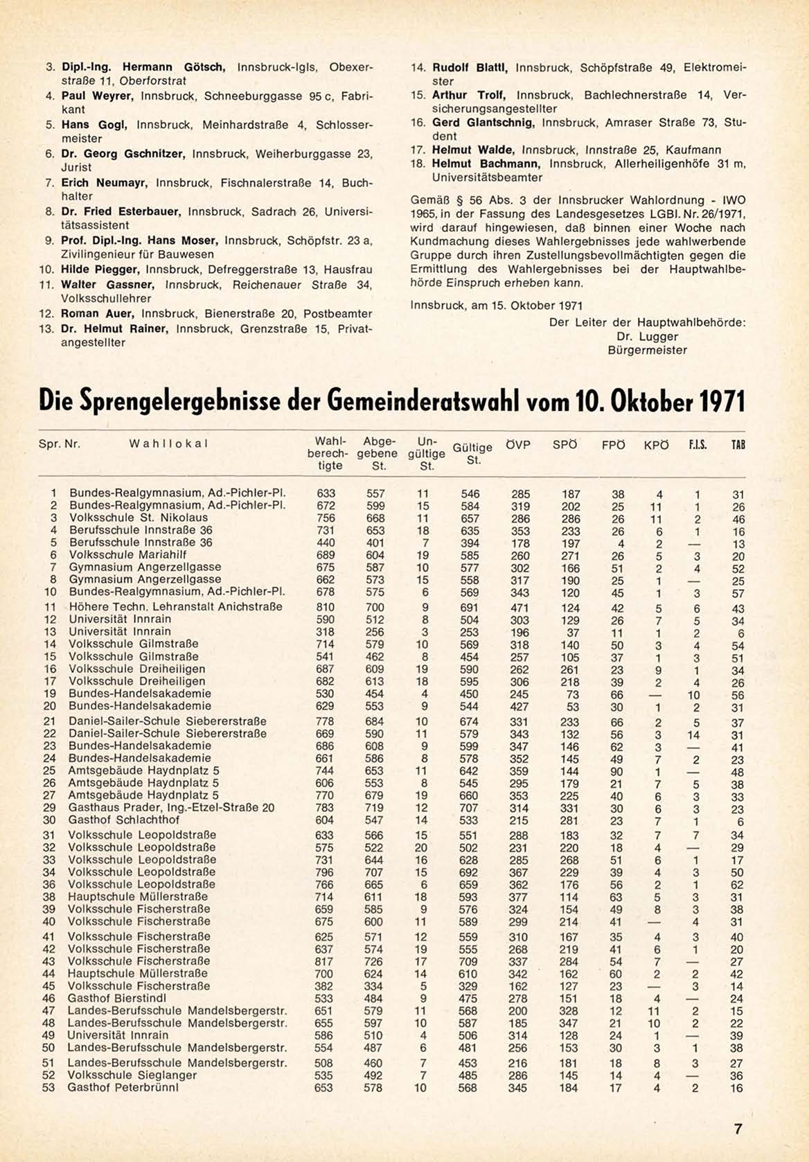 Die Sprengelergebnisse der Gemeinderatswahl vom 10. Okiober 1971