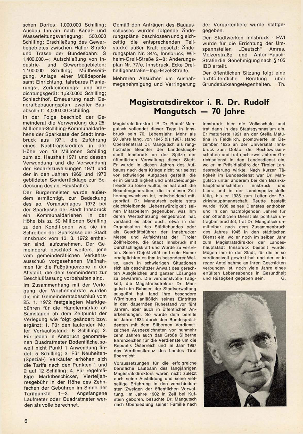 Magistratsdirektor i. R. Dr. Rudolf Mangutsch vollendet dieser Tage in Innsbruck sein 70. Lebensjahr. Mehr als