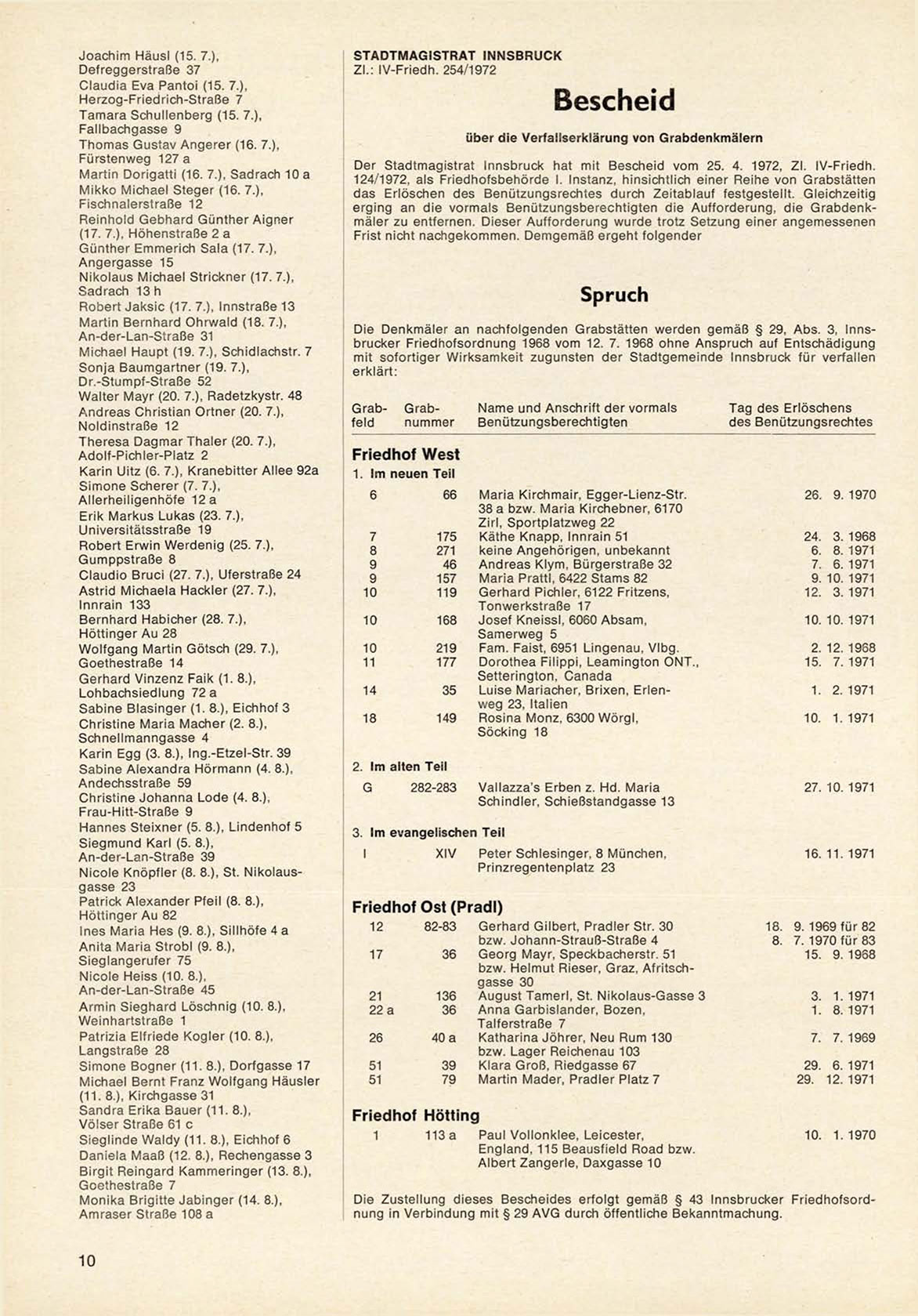 Der Stadtmagistrat Innsbruck hat mit B e s c h e i d v o m 25. 4. 1972, ZI. IV-Friedh.