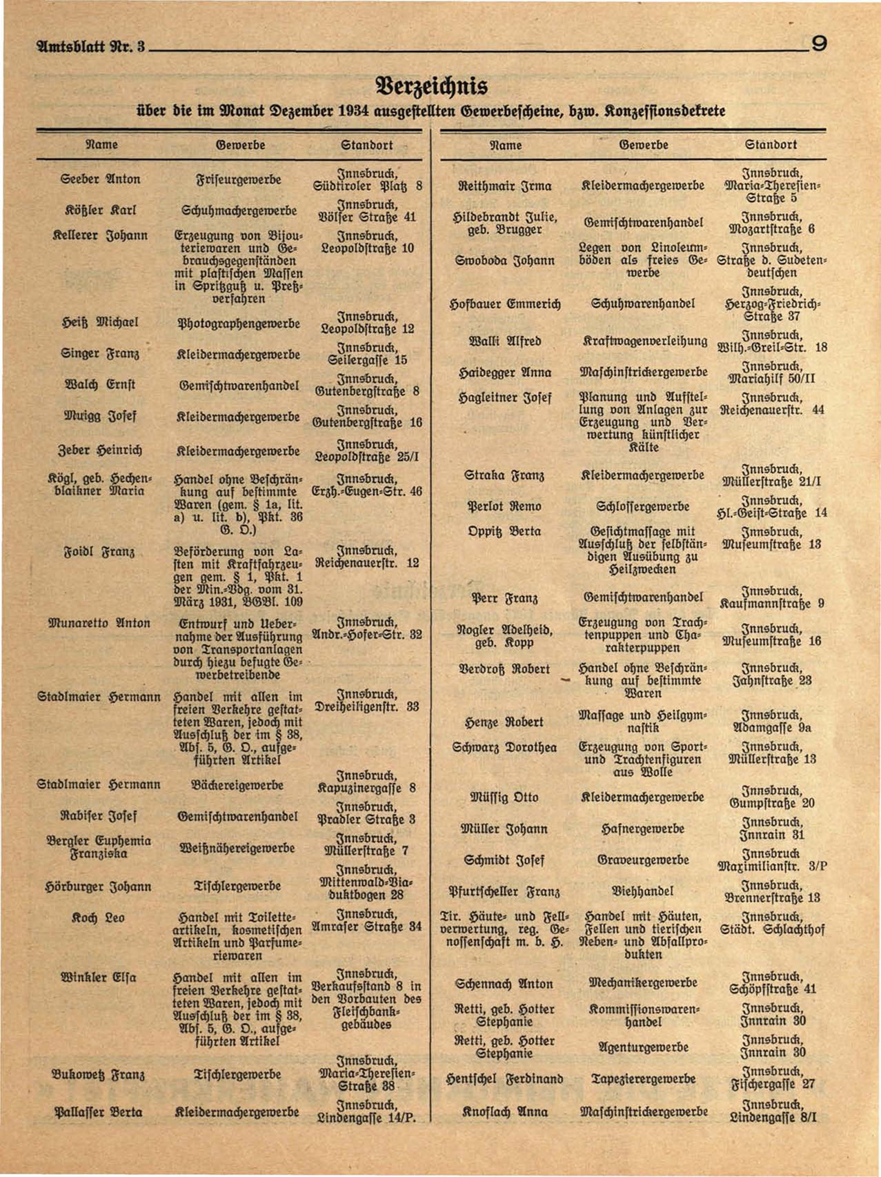über die i m Monat Dezember 1934 ausgestellten Gewerbescheine, bzw. Konzessionsdekrete