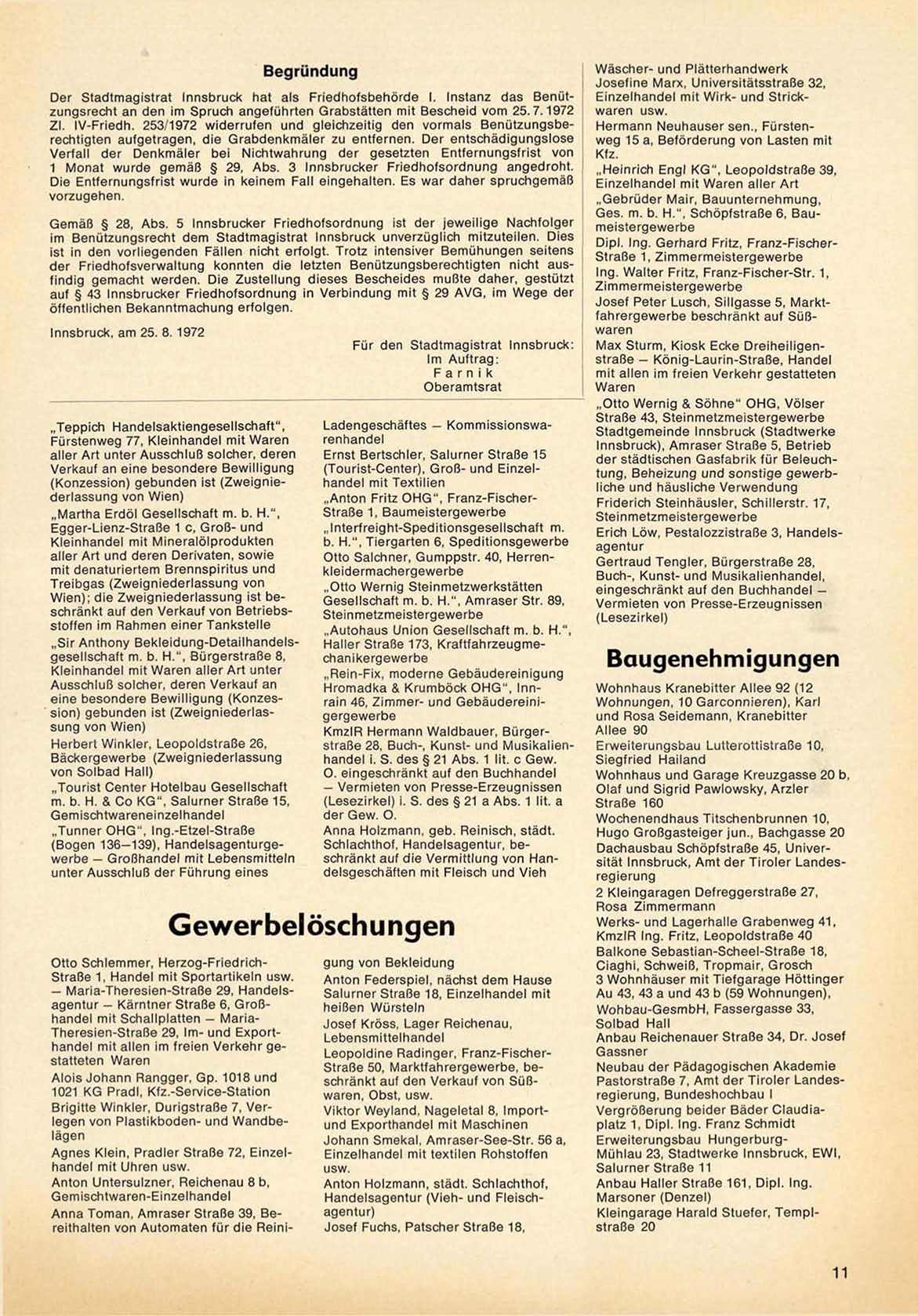 Der S t a d t m a g istrat Innsbruck hat als F r i e d h o f s b e h ö r d e I. Instanz d a s Benütz u n g s r e c h t an d e n im S p r u c h a n g e f ü h r t e n Grabstätten mit B e s c h e i d v o m 2 5 . 7 . 1 9 7 2