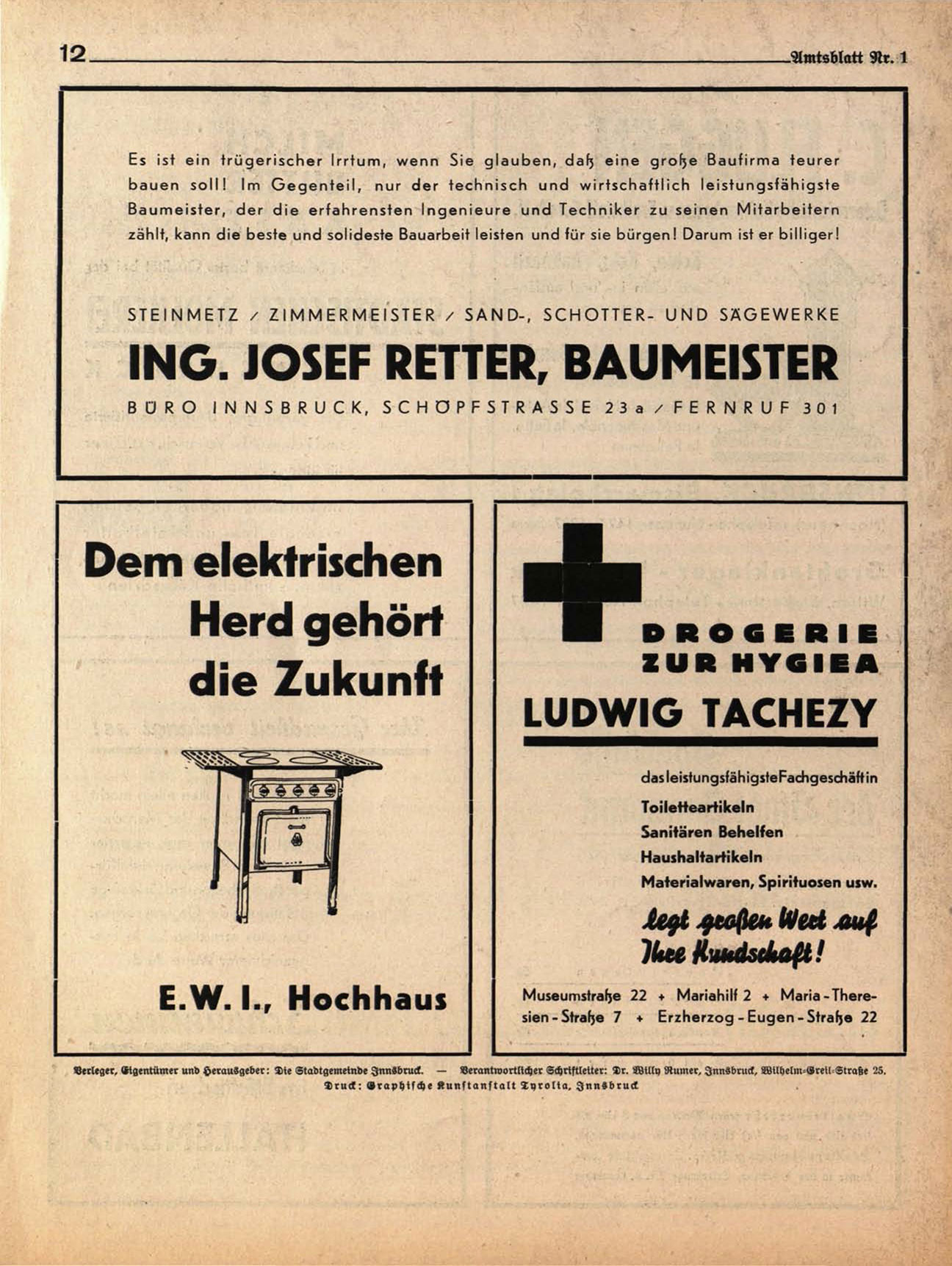 Nerleger, Eigentümer und Herausgeber: Me Stadtgemewde Innsbruck. — Verantwortlicher Schriftleiter: 2>r. Willy Rumer, Innsbruck, Wilhelm-Vreil-Straße 25.