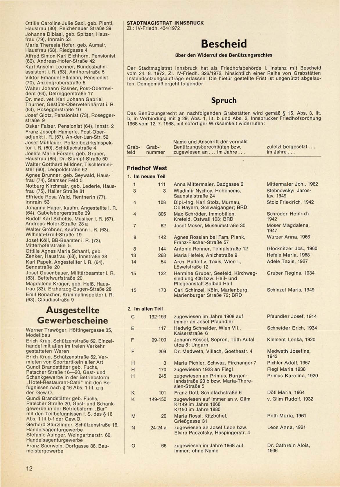 Der Stadtmagistrat Innsbruck hat als F r i e d h o f s b e h ö r d e I. Instanz mit B e s c h e i d