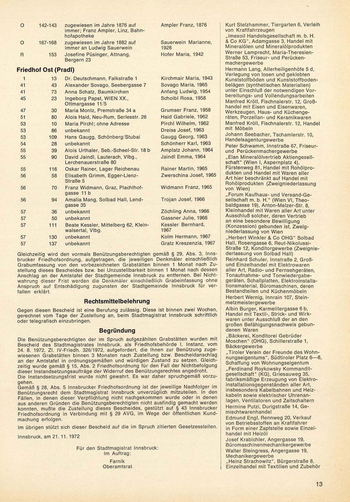 G l e i c h z e i t i g wird d e n v o r m a l s B e n ü t z u n g s b e r e c h t i g t e n gemäß § 29, A b s . 3, Innsbrucker F r i e d h o f s o r d n u n g , aufgetragen, die j e w e i l i g e n D e n k m ä l e r einschließlich