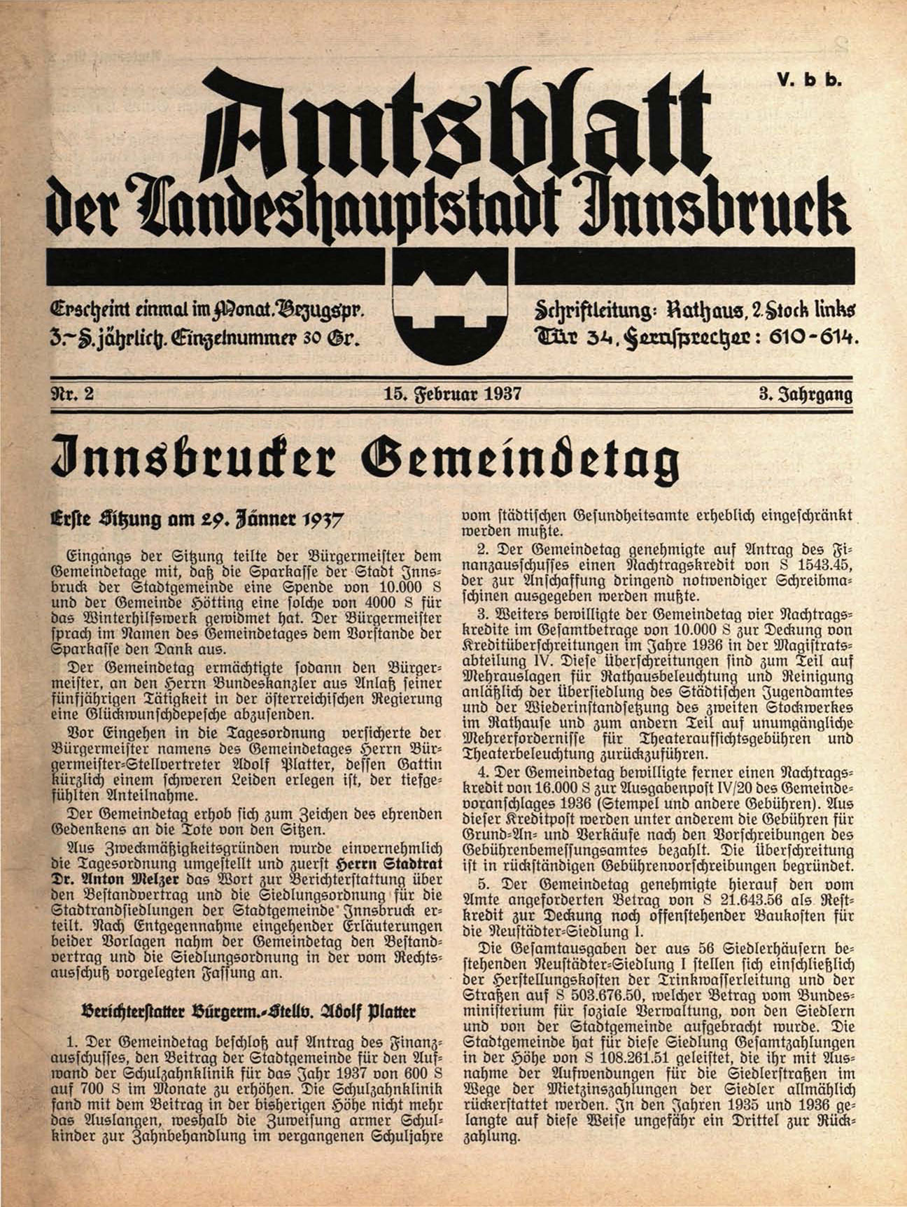 1. Der Gemeindetag beschloß auf Antrag des Finanzausschusses, den Veitrag der Etadtgemeinde für den Aufwand der Schulzahnklinik für das Jahr 1937 von 600 8