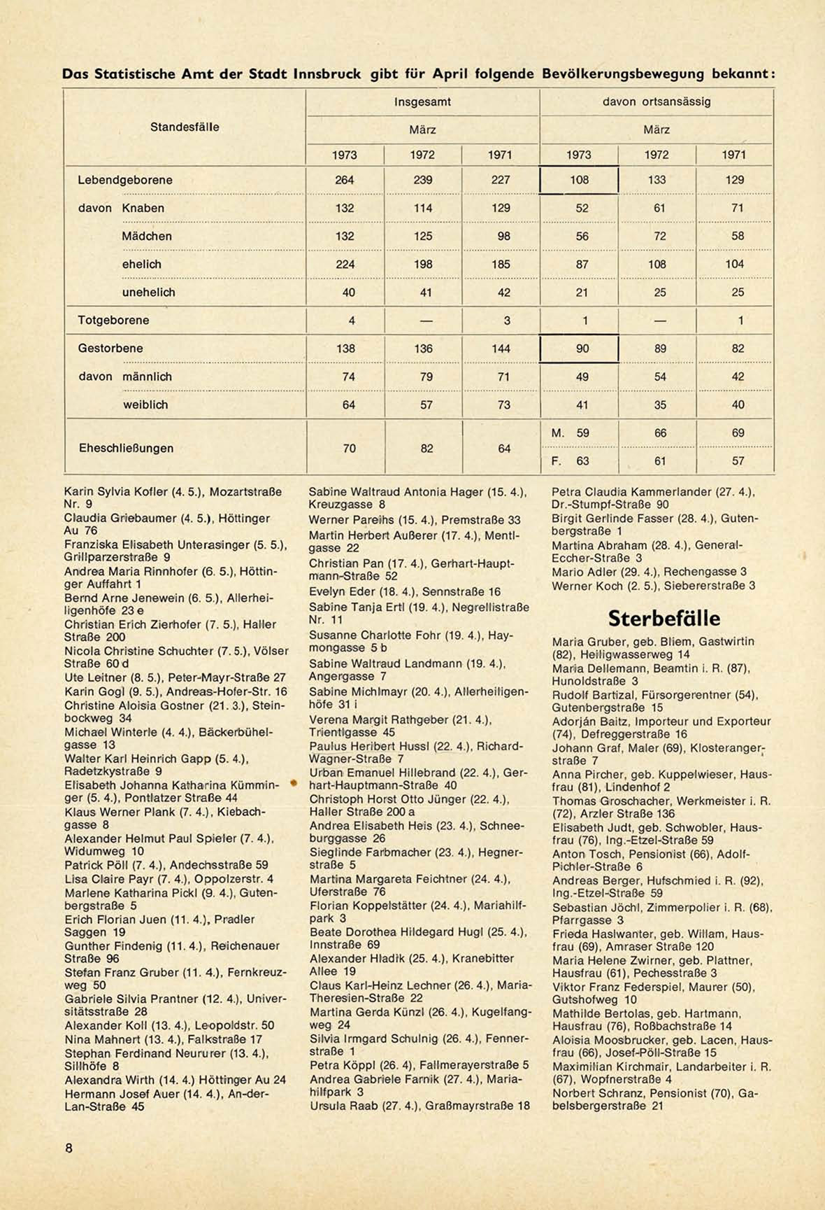 Das Statistische A m t der Stadt Innsbruck gibt für April folgende Bevölkerungsbewegung