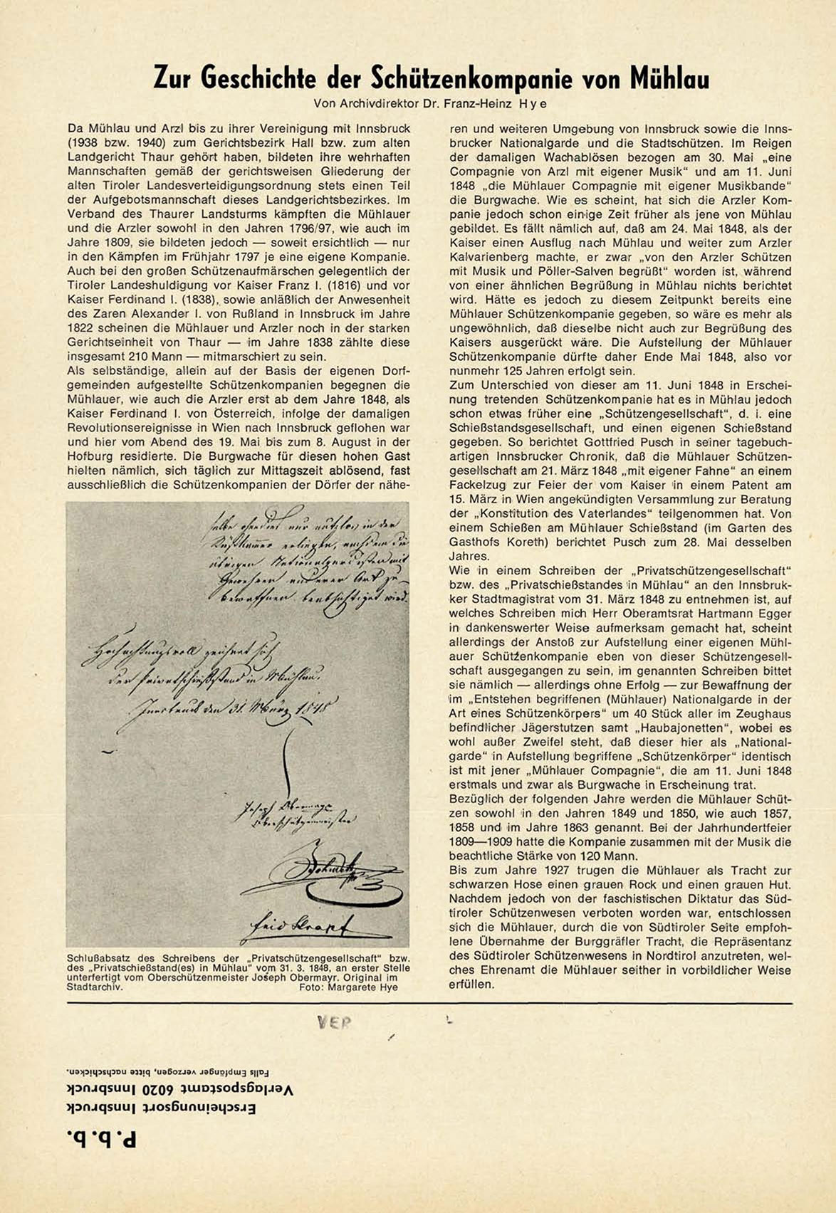 d e s S ü d t i r o l e r Schützenwesens in Nordtirol anzutreten, w e l ches E h r e n a m t die M ü h l a u e r s e i t h e r in v o r b i l d l i c h e r W e i s e