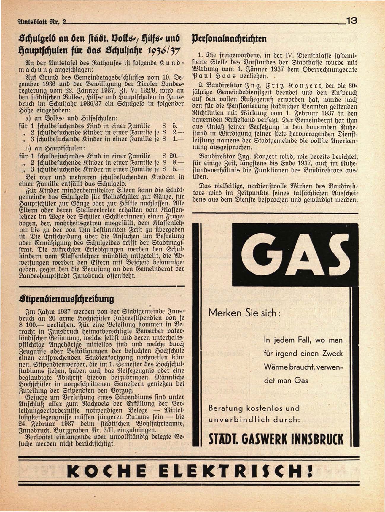 den städtischen Volks-, Hilfs- und Hauptschulen in Innsbruck im Schuljahr 1936/3? ein Schulgeld in folgender