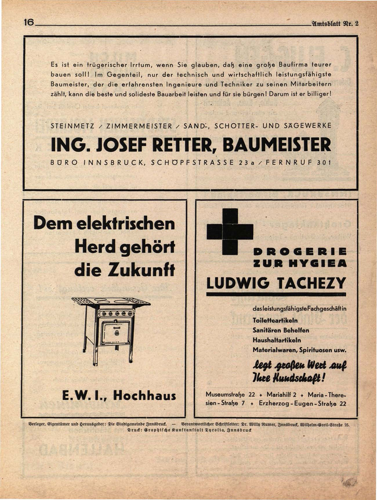 Verleger, Eigentümer und Herausgeber: Die Stadtgemeinde Innsbruck. — Verantwortlicher Schriftleiter: Dr. Willy Rumer, Innsbruck, Wilhelm-Greil-Straße 25.