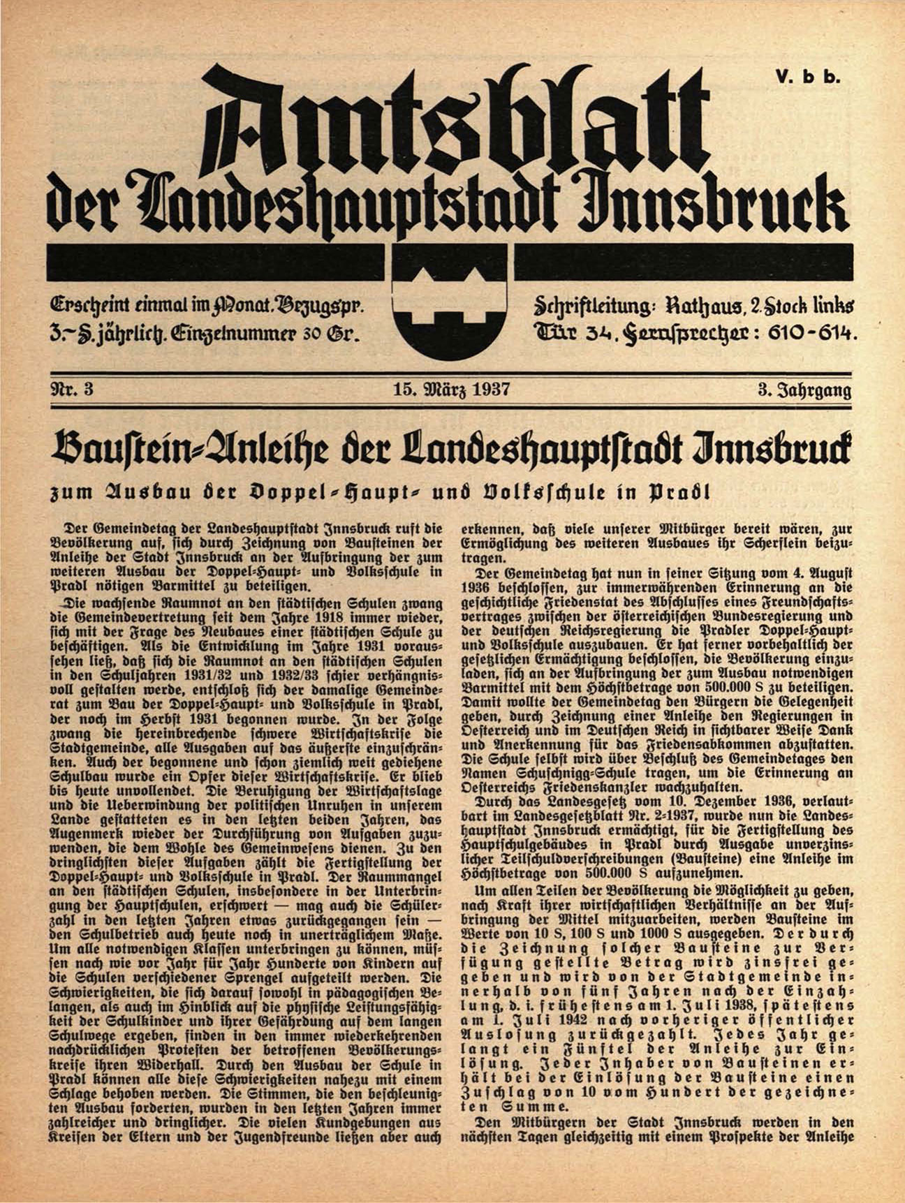 Hauptschulgebäudes in Pradl durch Ausgabe unverzinslicher Teilschuldverfchreibungen (Bausteine) eine Anleihe im