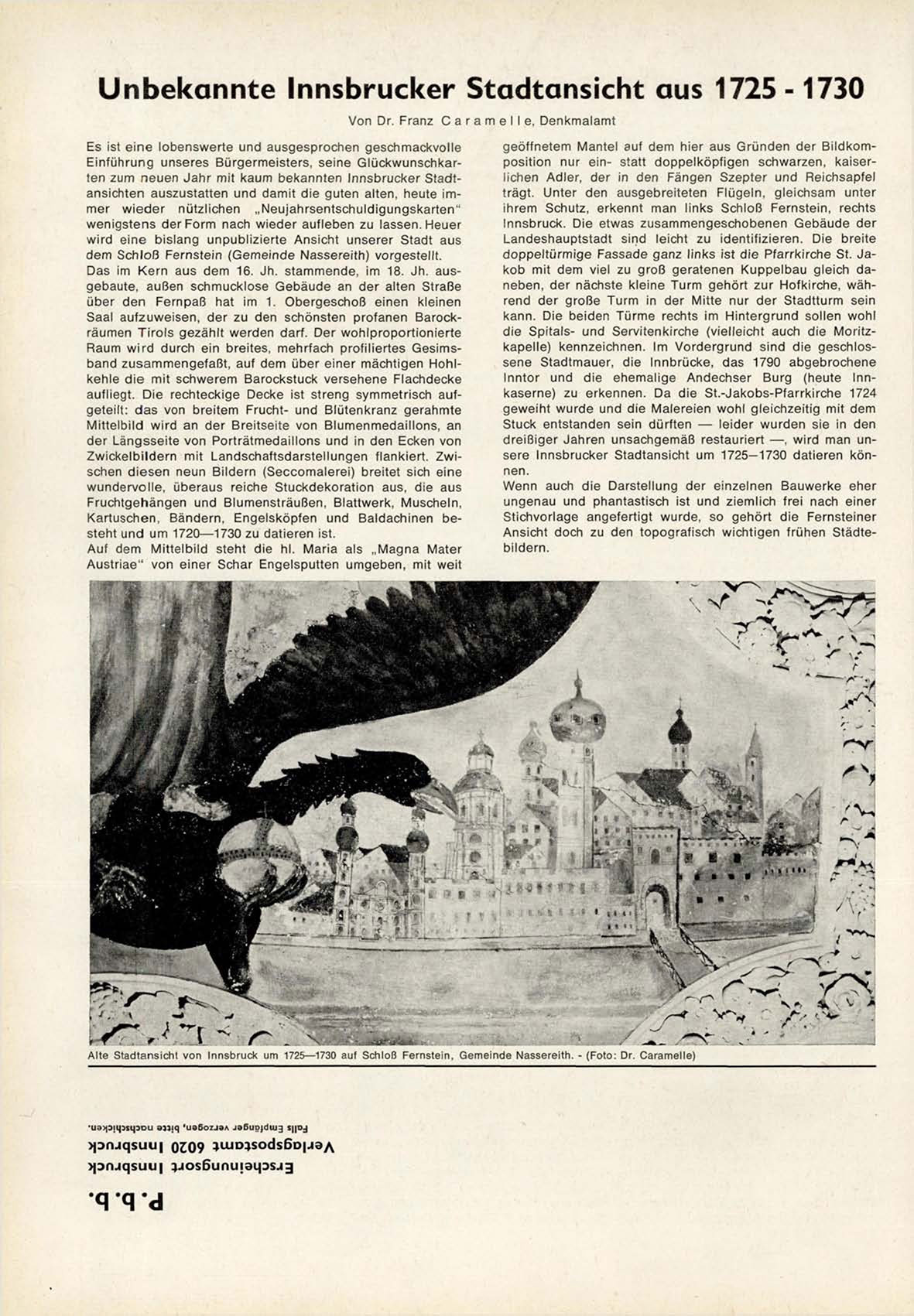 E i n f ü h r u n g u n s e r e s Bürgermeisters, s e i n e Glückwunschkarten z u m n e u e n J a h r mit kaum b e k a n n t e n Innsbrucker Stadta n s i c h t e n a u s z u s t a t t e n und damit die guten alten, heute i m mer w i e d e r nützlichen