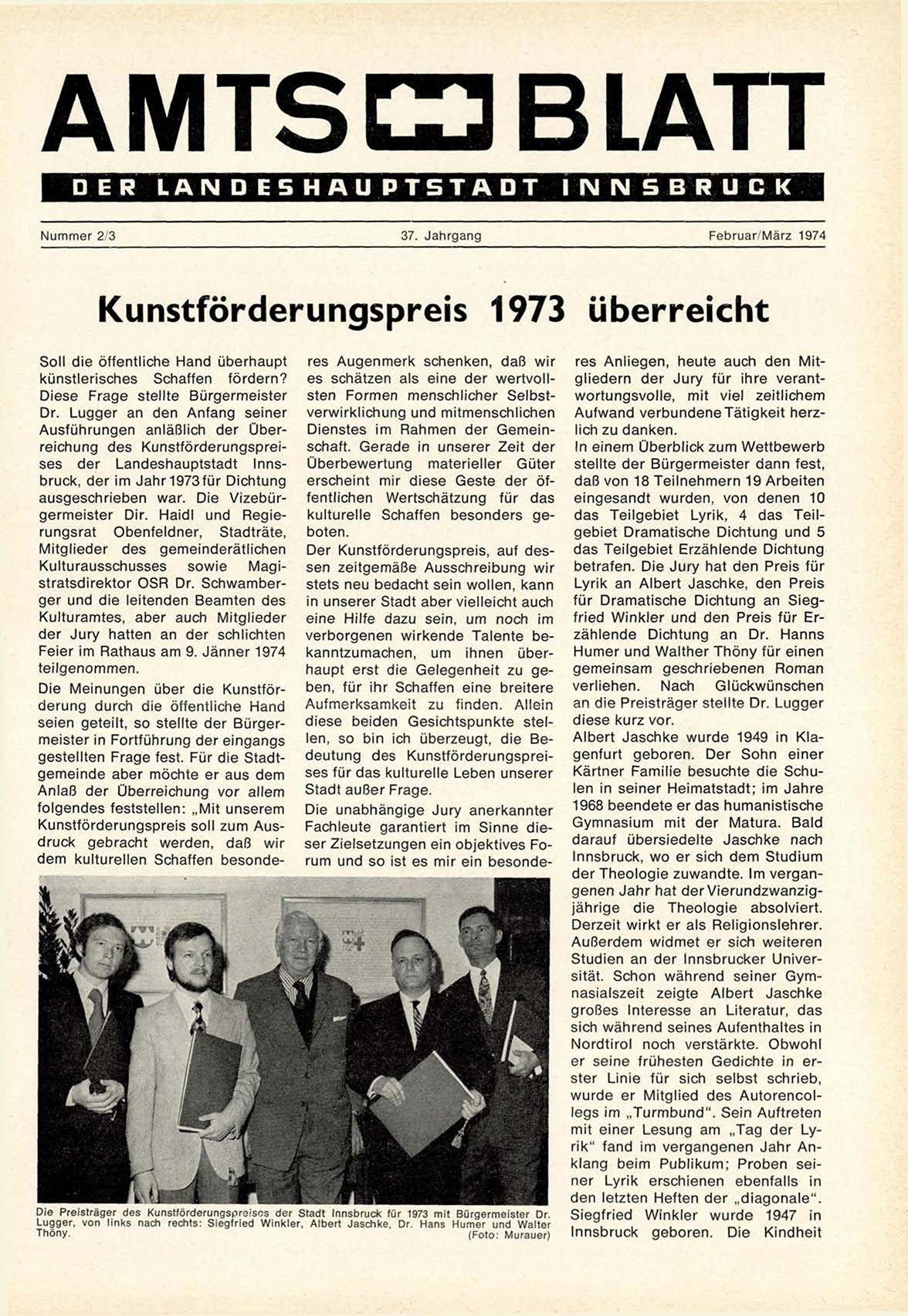Ausführungen anläßlich der Überreichung d e s Kunstförderungspreis e s der Landeshauptstadt Innsbruck, der im J a h r 1 9 7 3 f ü r Dichtung