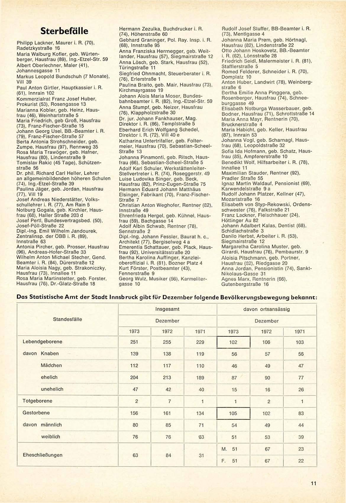 Das Statistische A m t der Stadt Innsbruck gibt f ü r D e z e m b e r folgende B e v ö l k e r u n g s b e w e g u n g