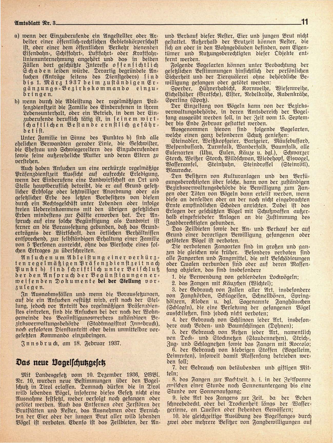 Nr. 10, wurden neue Bestimmungen über den Vogelschutz in Tirol erlassen. Demnach dürfen die in Tirol