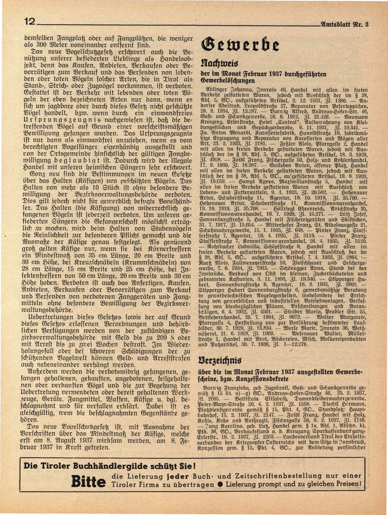 über die im Monat Februar 1937 ausgestellten Gewerbe»