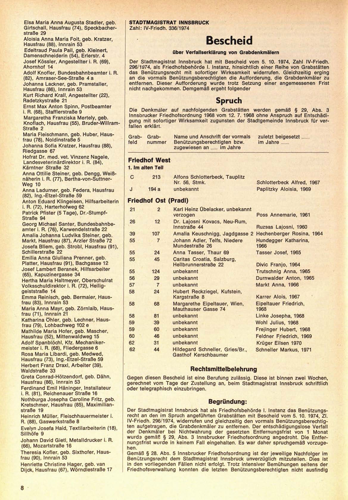 Der Stadtmag istrat Innsbruck hat mit Bescheid vom 5. 10. 1974, Zahl IV-Friedh.