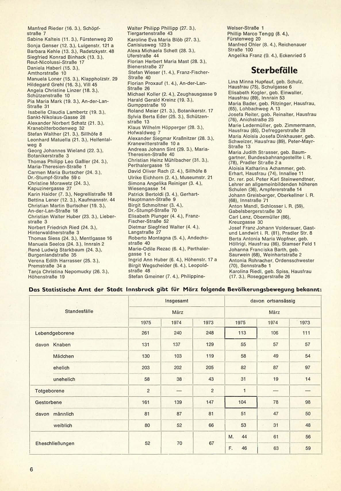 Das Statistische A m t der Stadt Innsbruck gibt für M ä r z folgende Bevölkerungsbewegung bekannt: