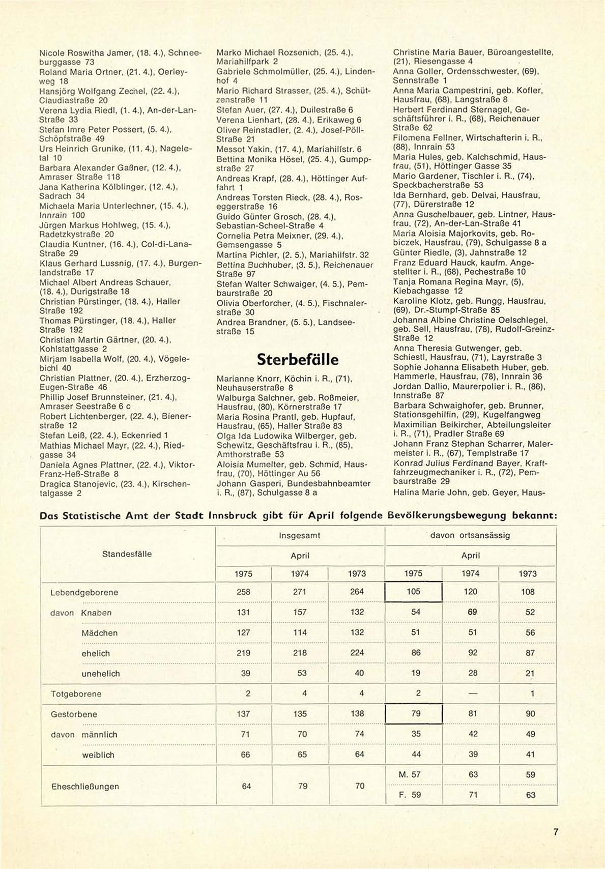 Das Statistische Amt der Stadt Innsbruck gibt für April folgende Bevölkerungsbewegung
