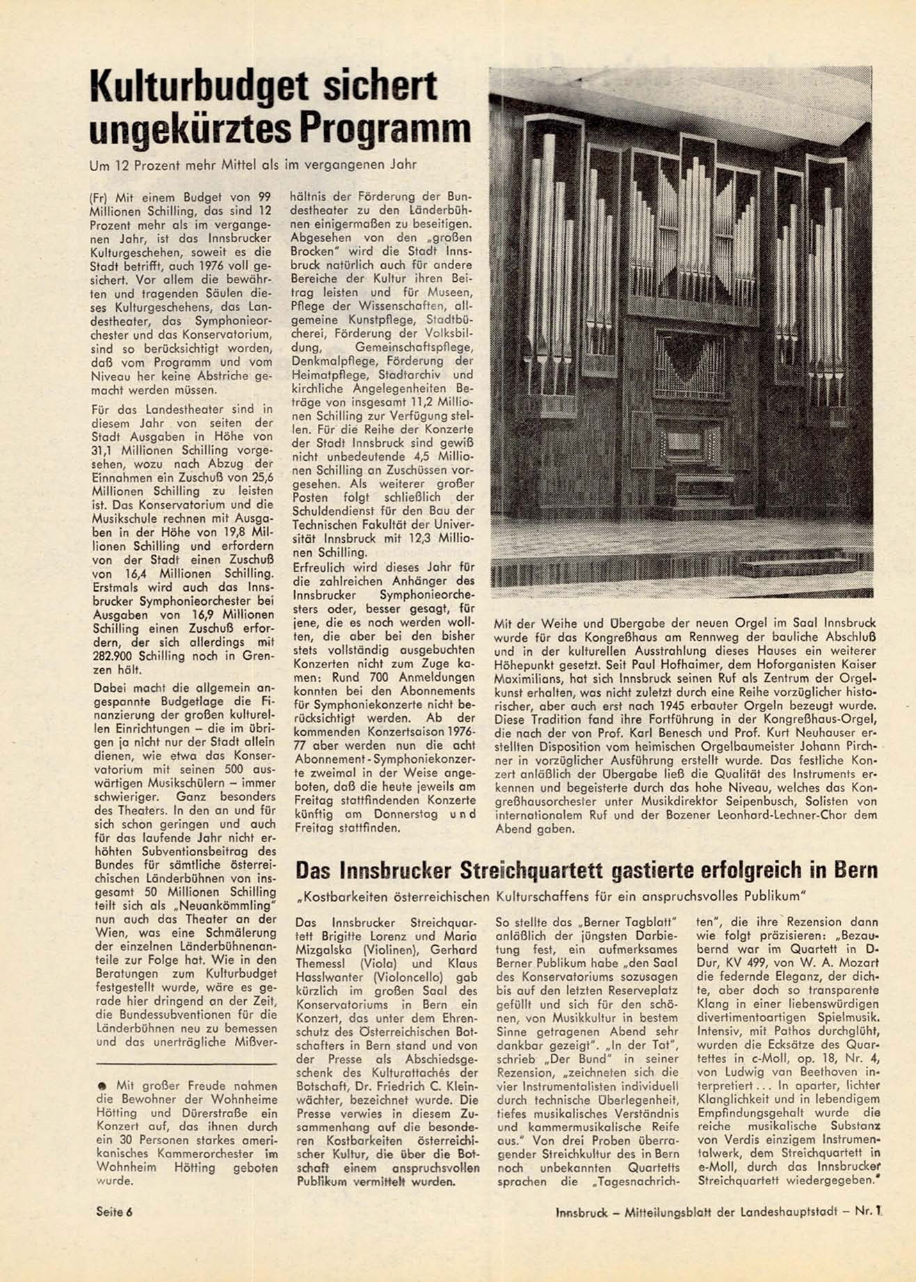 Stadt betrifft, auch 1976 voll gesichert. Vor allem die bewährten und tragenden Säulen dieses Kulturgeschehens, das Landestheater, das Symphonieorchester und das Konservatorium,