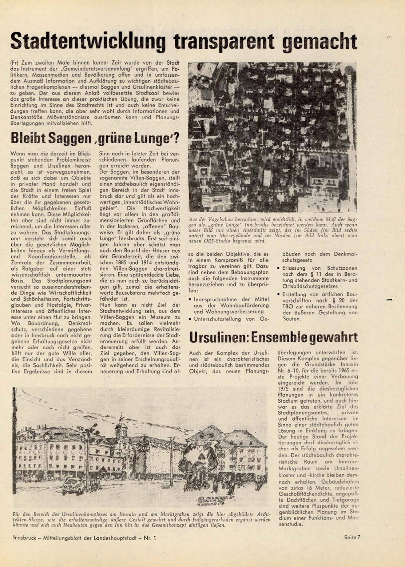 das Instrument der „Gemeinderatsversammlung" ergriffen, um Politikern, Massenmedien und Bevölkerung offen und in umfassendem Ausmaß Information und Aufklärung zu wichtigen städtebaulichen Fragenkomplexen — diesmal Saggen und Ursulinenkloster —