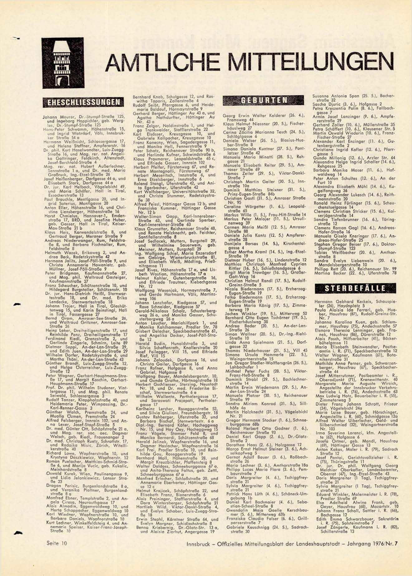 Innsbruck - Offizielles Mitteilungsblatt der Landeshauptstadt - Jahrgang 1976."Nr. 7