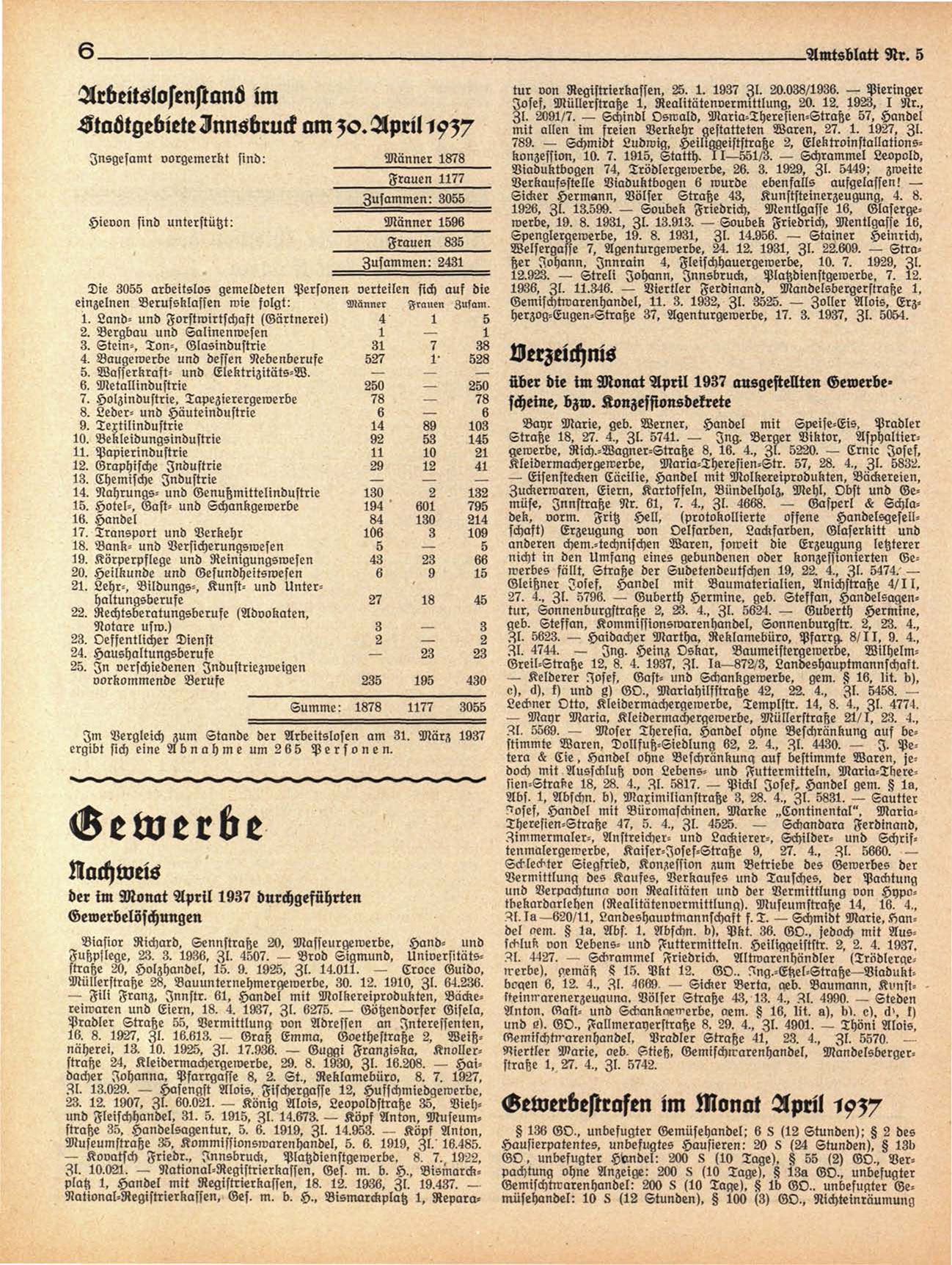 — Fili Franz, Innstr. 61, Handel mit Molkereiprodukten. Bäckereiwaren und Eiern. 18. 4. 1937. Zl. 6275. — Götzendorfer Gisela,
