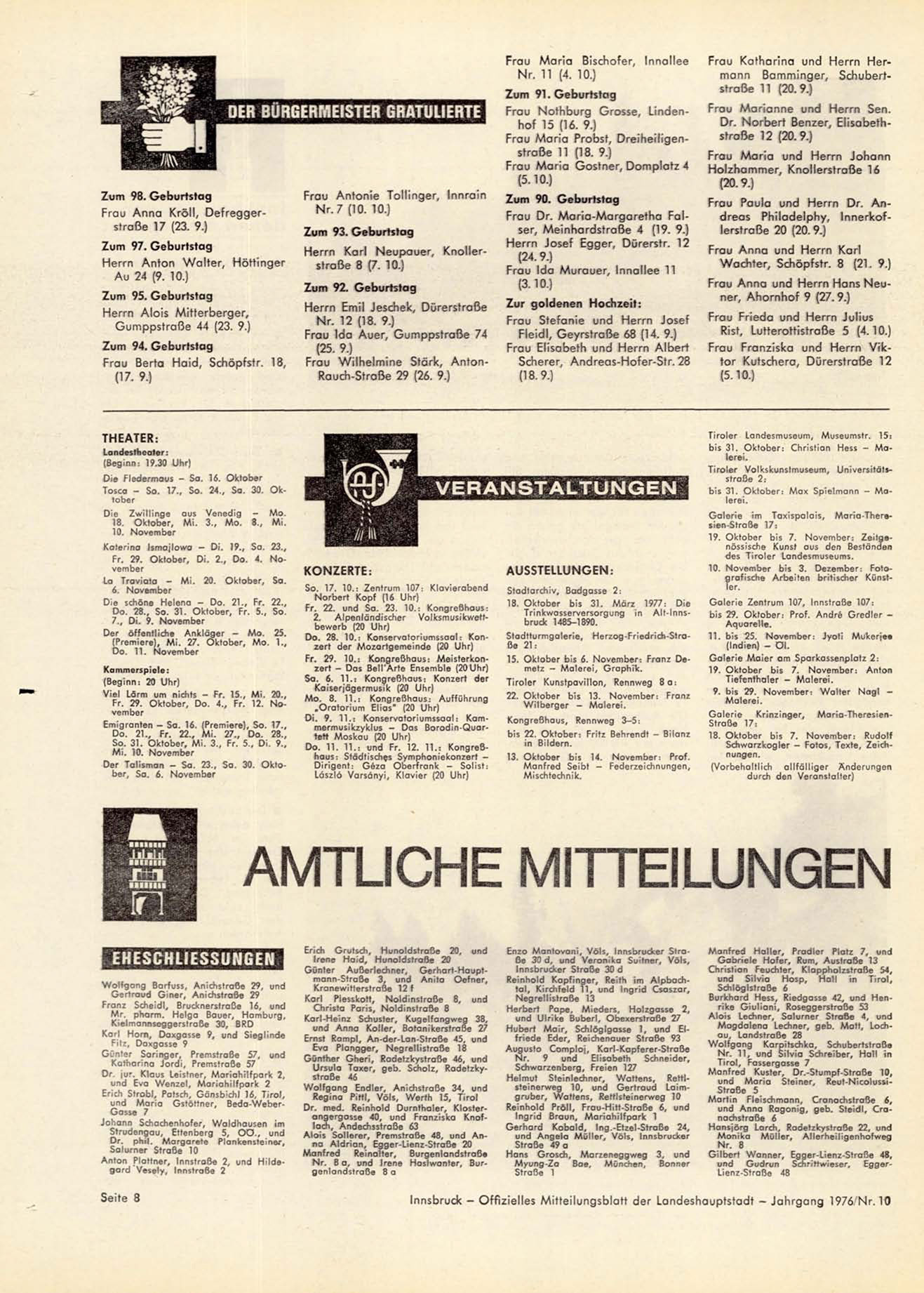 Innsbruck - O f f i z i e l l e s M i t t e i l u n g s b l a t t d e r Landeshauptstadt - J a h r g a n g 1976/Nr. 10