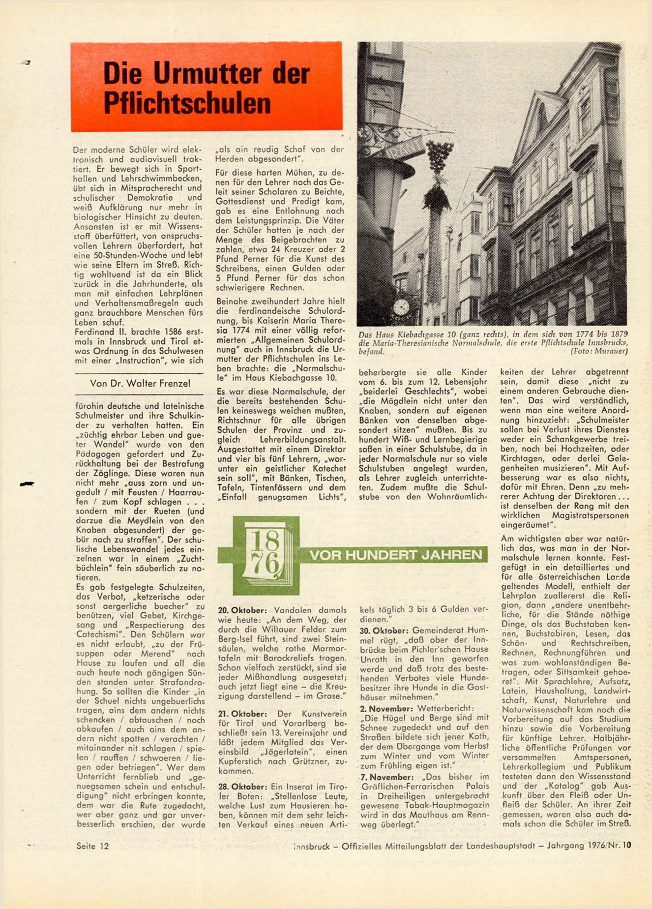 ferdinandeische Schulordn u n g , bis K a i s e r i n M a r i a Theres i a 1774 mit einer v ö l l i g reformierten „ A l l g e m e i n e n S c h u l o r d n u n g " auch in Innsbruck die U r mutter der Pflichtschulen ins Leben b r a c h t e : d i e „ N o r m a l s c h u l e " im H a u s K i e b a c h g a s s e 10.