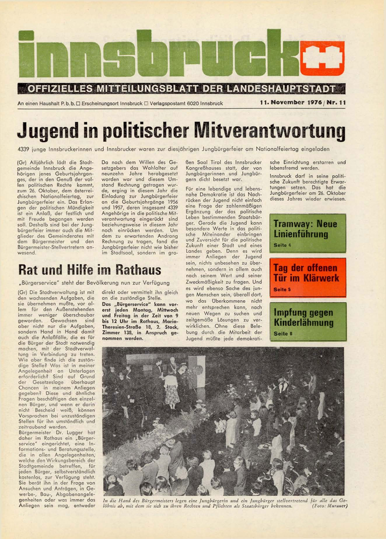 (Gr) A l l j ä h r l i c h lädt d i e Stadtg e m e i n d e Innsbruck d i e A n g e h ö r i g e n jenes G e b u r t s j a h r g a n ges, der in den G e n u ß der v o l len politischen Rechte kommt,
