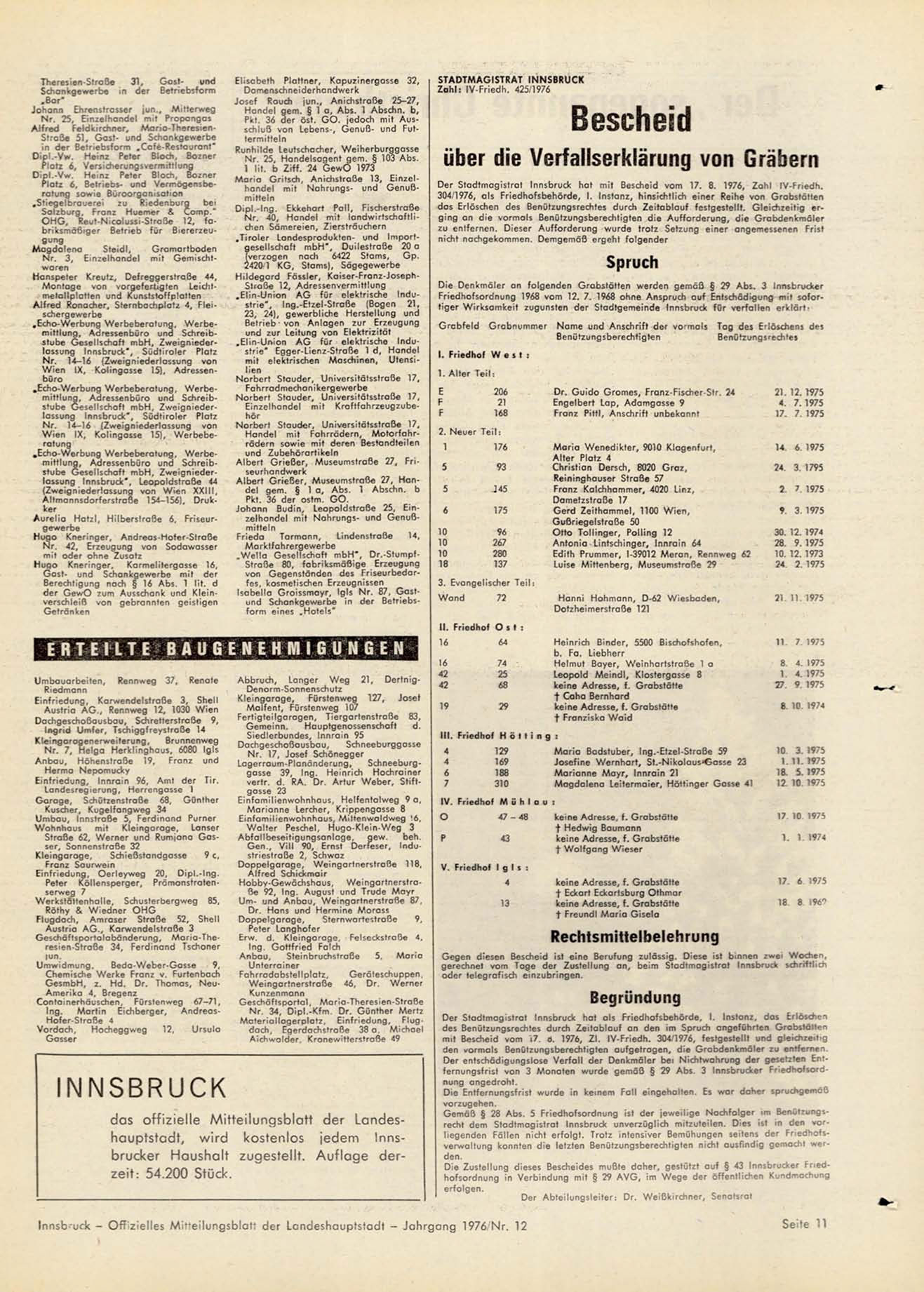 Innsbruck - Offi zielles Mitteilungsblatt d e r L a n d e s h a u p t s t a d t - J a h r g a n g 1976/Nr. 12