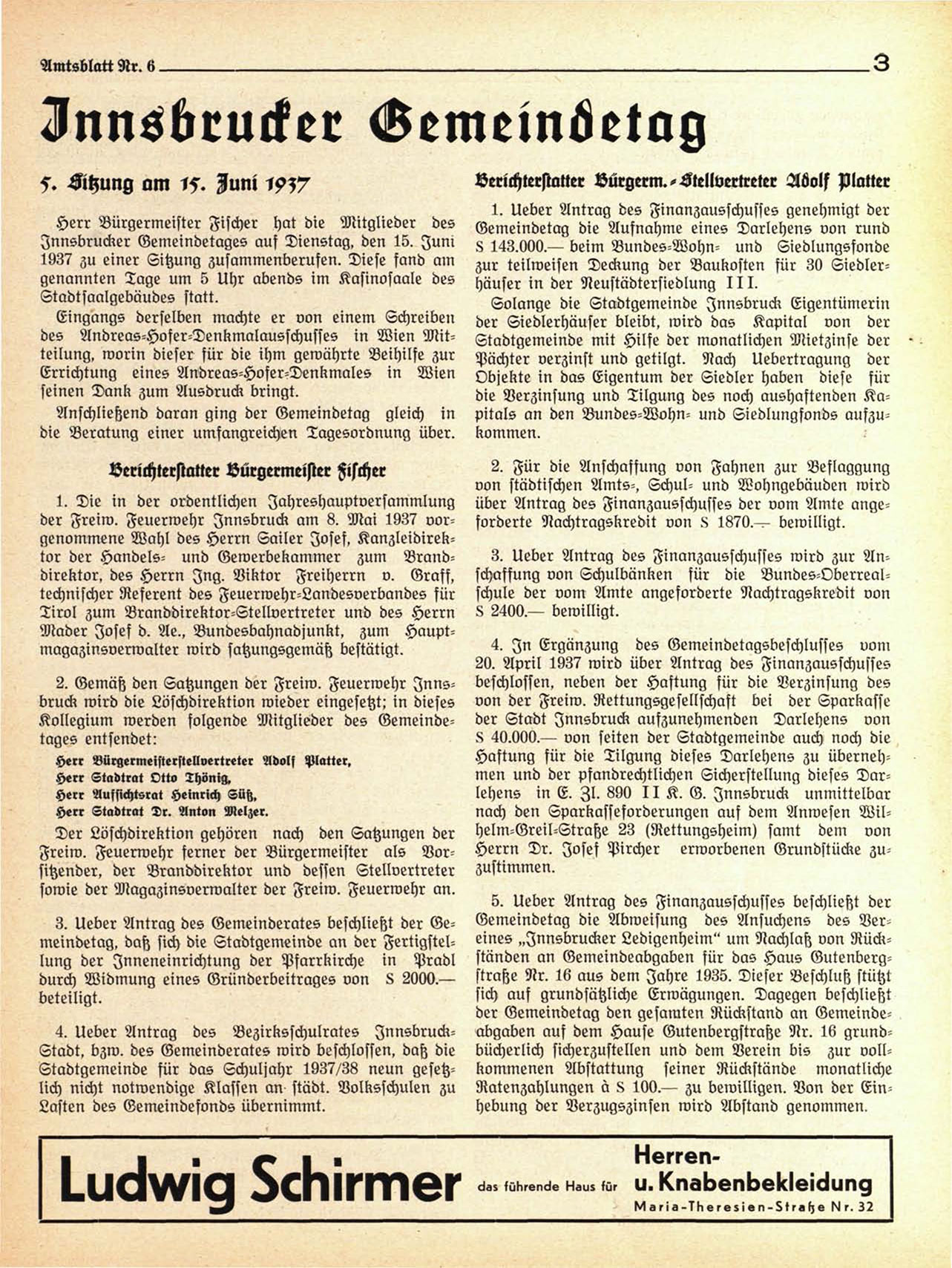 der Gemeindetag den gesamten Rückstand an Gemeinde4. Ueber Antrag des Bezirksschulrates Innsbruck- abgaben auf dem Haufe Gutenbergstraße Nr. 16 grundStadt, bzw. des Gemeinderates wird beschlossen, daß die bücherlich sicherzustellen und dem Verein bis zur vollStadtgemeinde für das Schuljahr 1937/38 neun gesetz- kommenen Abstattung seiner Rückstände monatliche