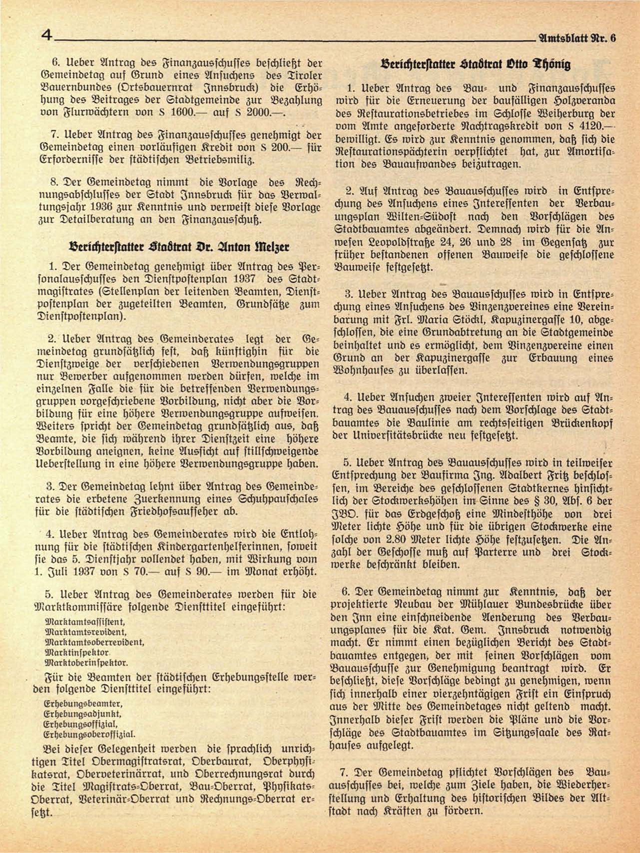 1. Der Gemeindetag genehmigt über Antrag des Personalausschusses den Dienstpostenplan 1937 des Stadtmagistrates (Stellenplan der leitenden Beamten, Dienstpostenplan der Zugeteilten Beamten, Grundsätze zum