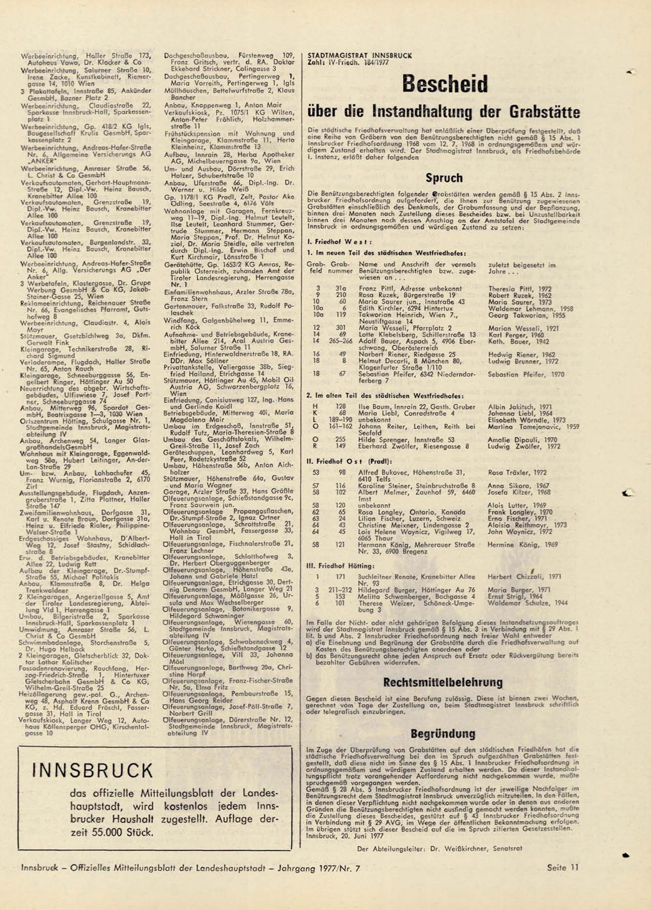 die Zustellung dieses Bescheides, gestützt auf § 43 Innsbrucker Friedhofsordnung