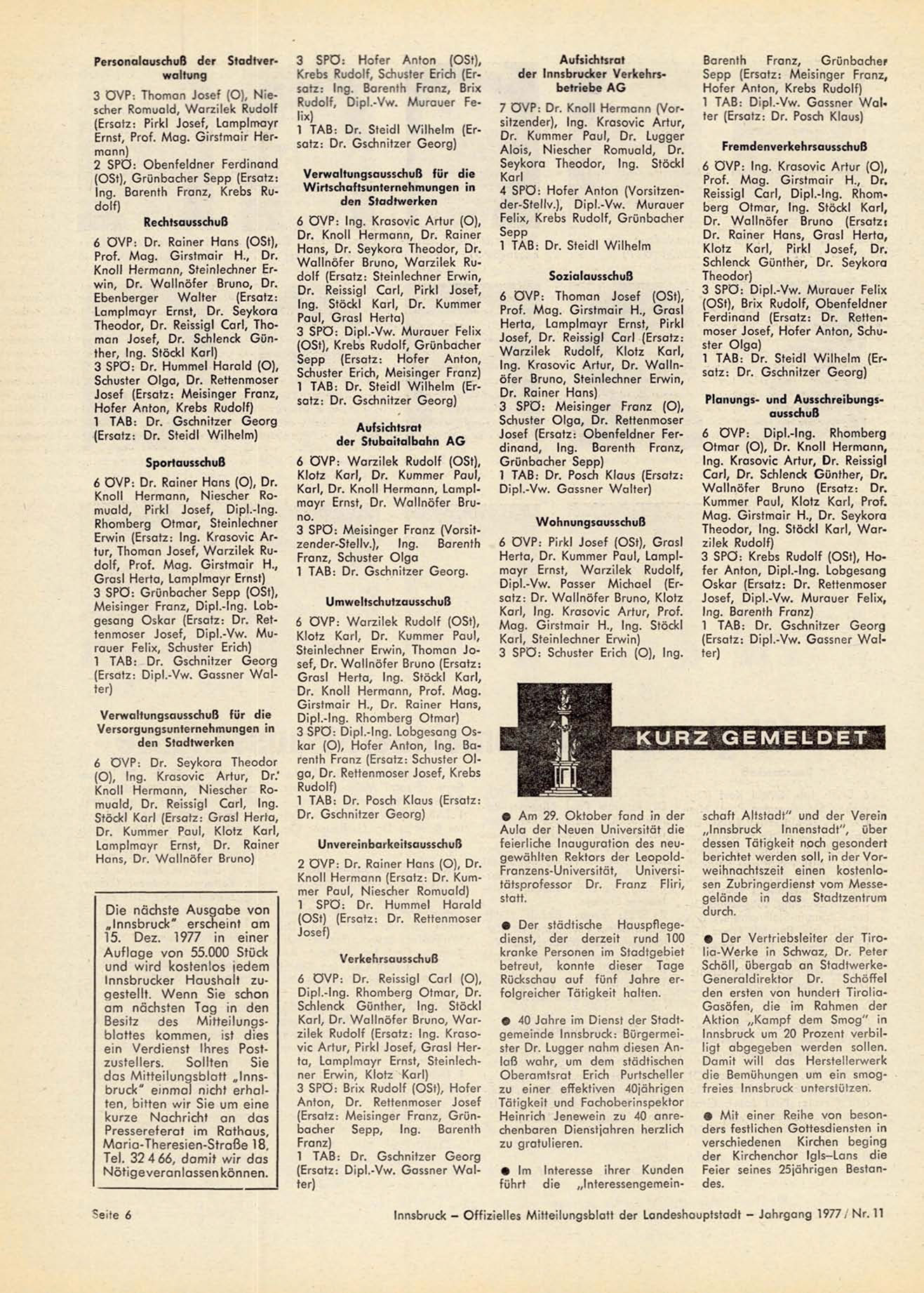 Innsbruck - O f f i z i e l l e s M i t t e i l u n g s b l a t t der L a n d e s h a u p t s t a d t - J a h r g a n g 1 9 7 7 ; N r . 11