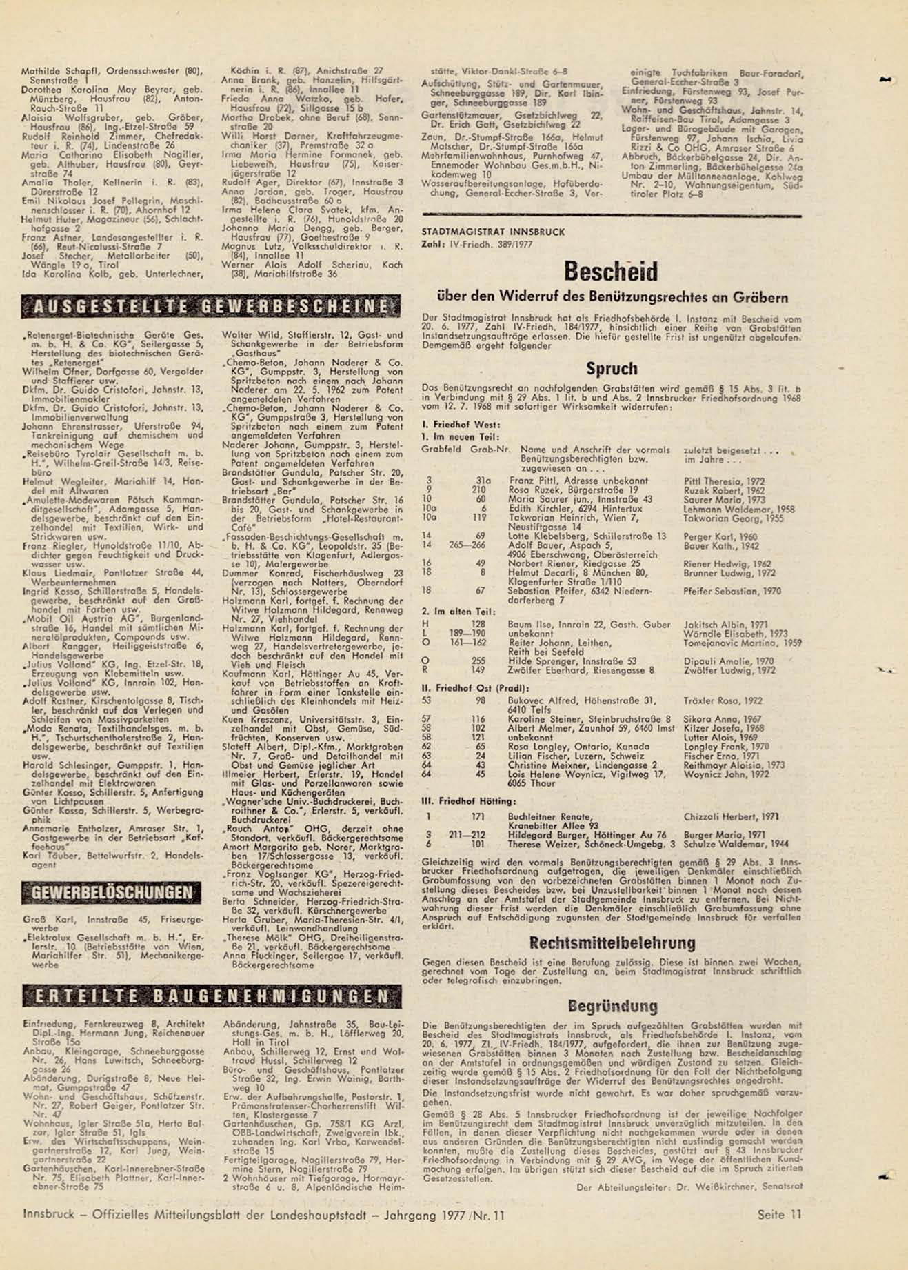 Innsbruck - Offizielles Mitteilungsblatt der Landeshauptstadt - Jahrgang 1977/Nr. 11