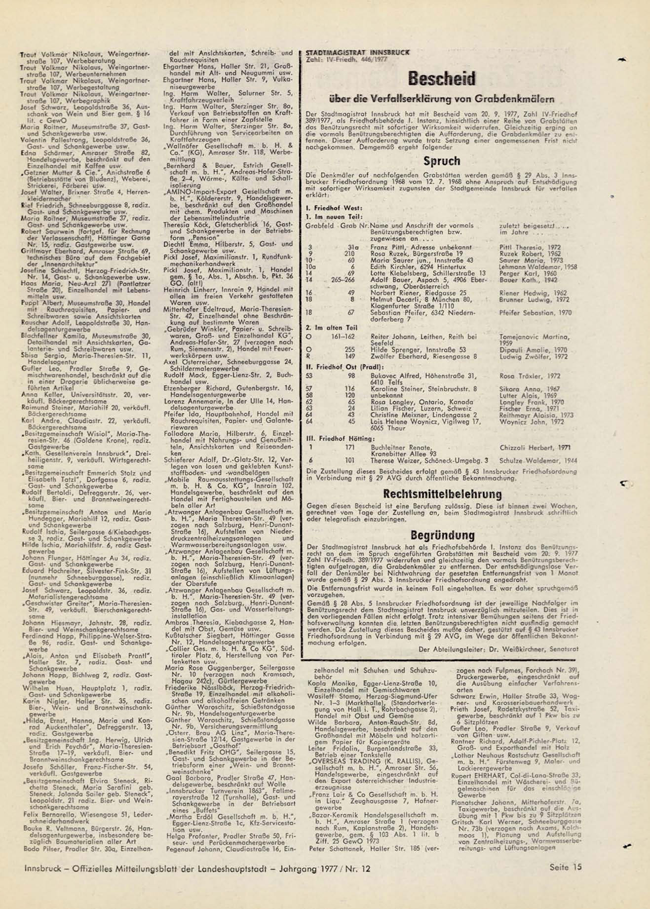 Innsbruck - O f f i z i e l l e s M i t t e i l u n g s b l a t t der Landeshauptstadt - J a h r g a n g 1977 / N r . 12