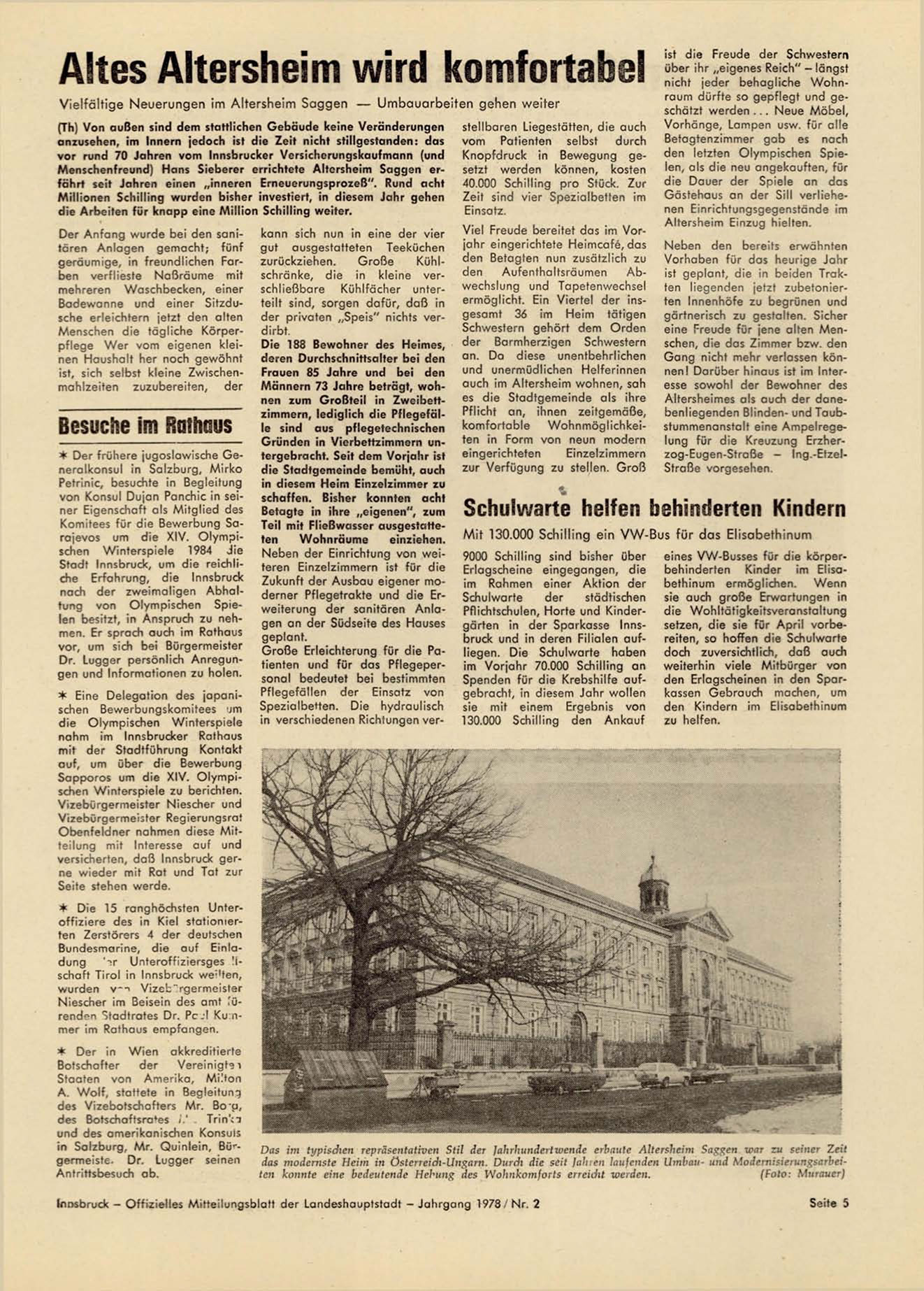 Menschenfreund) Hans Sieberer errichtete Altersheim Saggen erfährt seit Jahren einen „inneren Erneuerungsprozeß". Rund acht