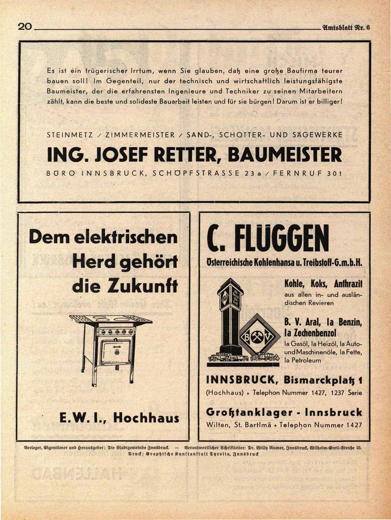Verleger, Eigentümer und Herausgeber: Die Stadtgemetnde Innsbruck. — Verantwortlicher Schriftleiter: 2>r. Willy Rumer, Innsbruck, Wilhelm-Oretl-Straße 25.