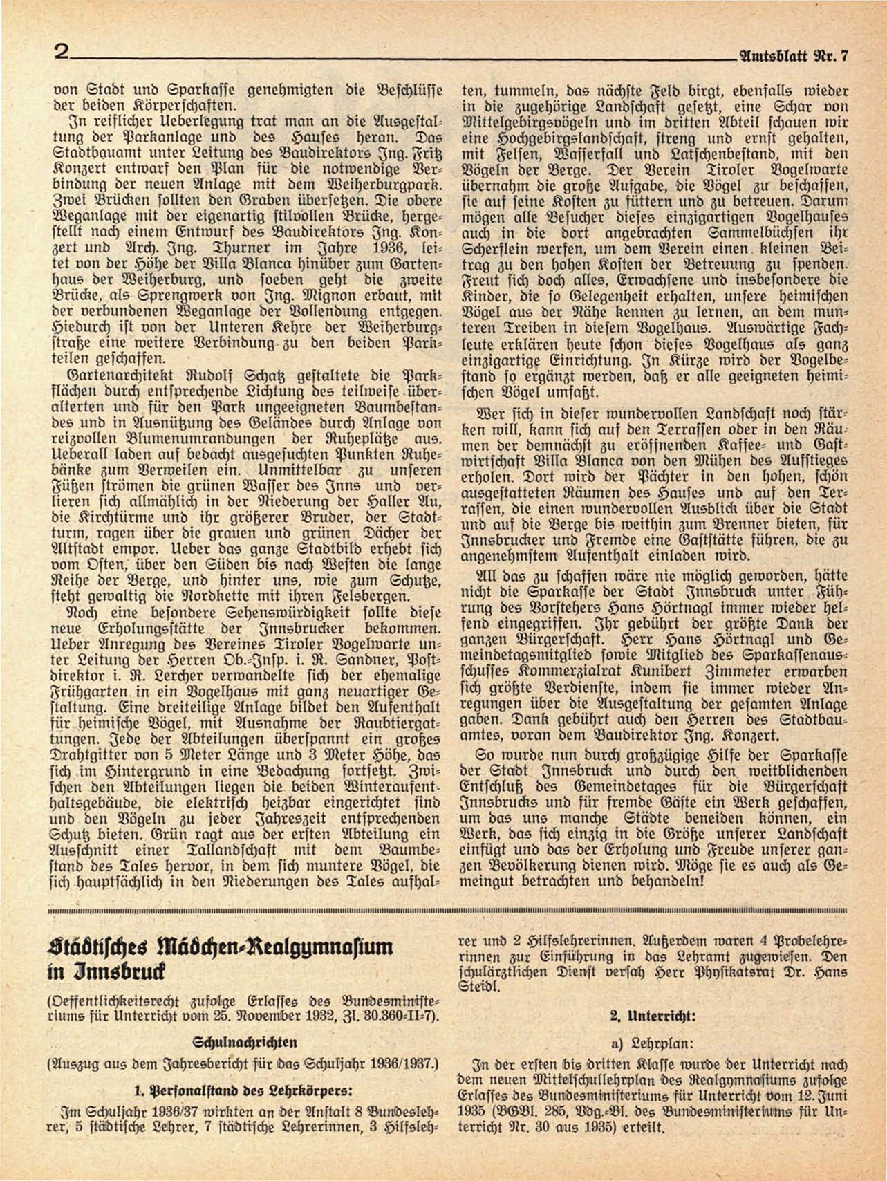 Ueber Anregung des Vereines Tiroler Vogelwarte unter Leitung der Herren Ob.-Insv. i. R. Sandner, Postdirektor i. R. Lercher verwandelte sich der ehemalige
