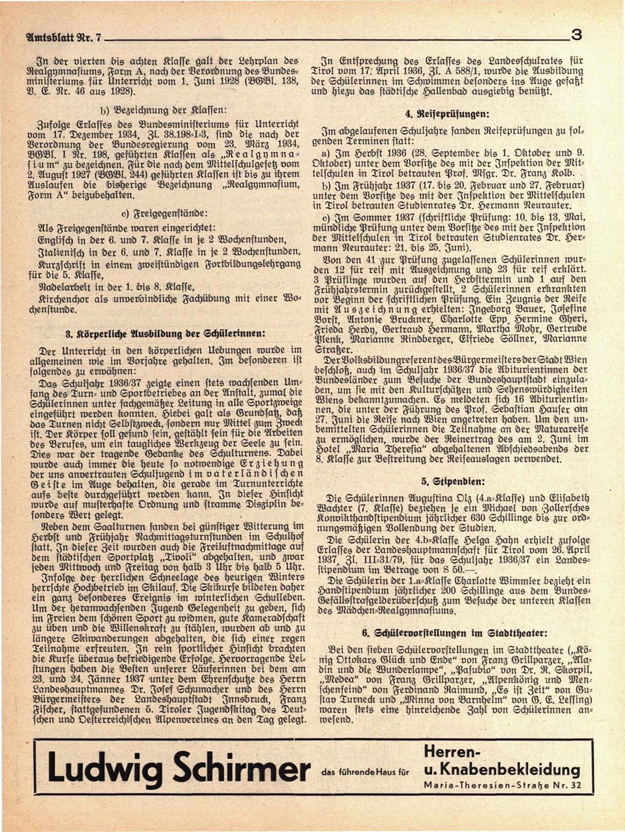 dem städtischen Sportplatz „Tivoli" abgehalten, und Zwar 1937. Zl. 111-31/79, für das Schuljahr 1936/37 ein üandesjoden Mittwoch und Freitag von halb 3 Uhr bis halb 5 Uhr. stipendium im Betrage von 8 50.—.